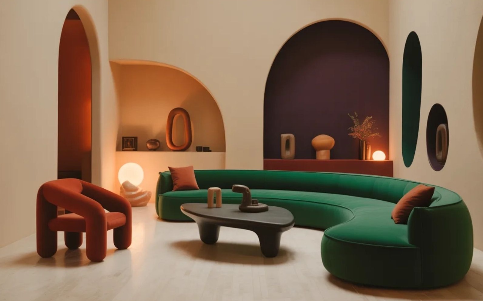 Az ívelt bútorok továbbra is meghatározók maradnak. Lekerekített kanapék, szoborszerű székek és organikus formájú asztalok oldottabb térélményt és intimebb beszélgetési zónákat hoznak létre.