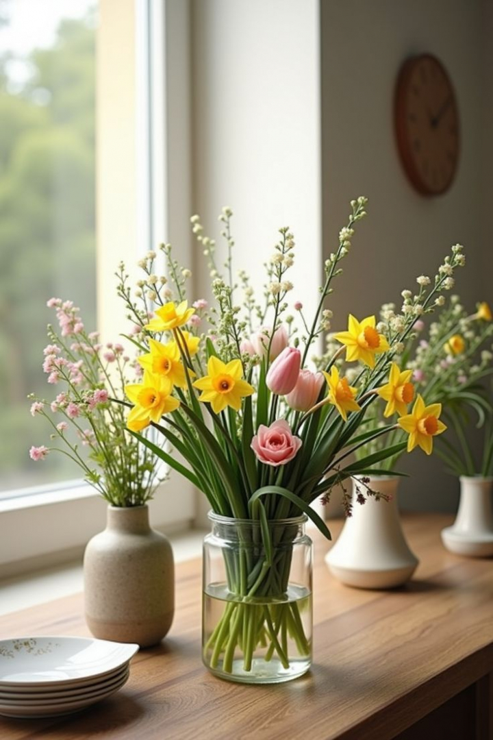 Minél több virág, annál jobb! Ne állj meg egyetlen vázánál, inkább csoportosíts többet különböző helyeken és formában. Ez a rétegezett elrendezés igazán látványos hatást kelt. Keverhetsz élő és művirágokat is a tartósság érdekében.