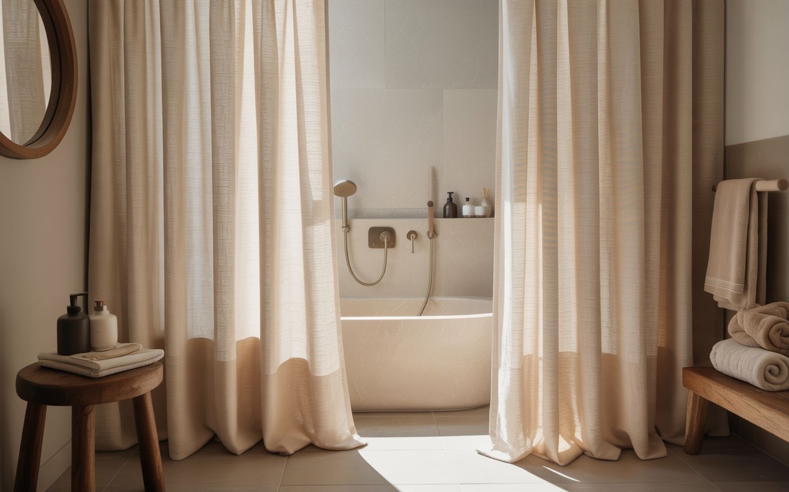 A műanyag zuhanyfüggöny ideje lejárt. 2026-ban a zuhanyfüggöny belsőépítészeti elemmé válik. A padlótól mennyezetig érő textíliák optikailag megnyújtják a teret, miközben melegebb, otthonosabb hangulatot teremtenek.