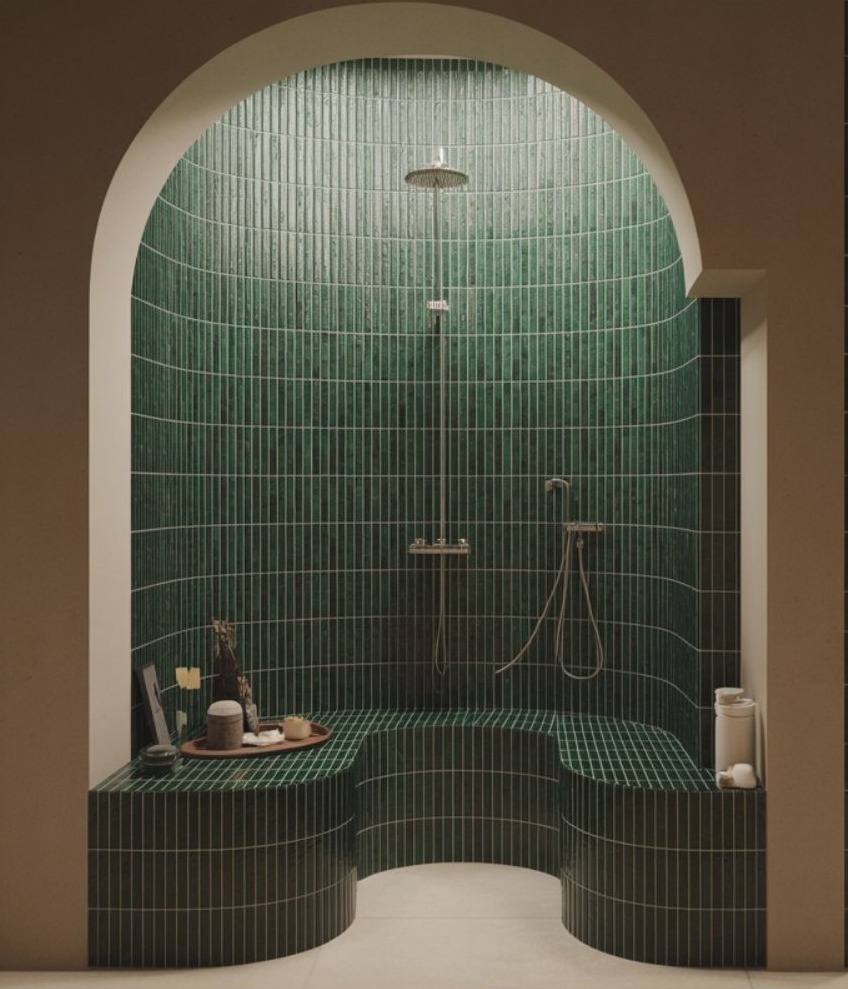 A klasszikus fehér csempék háttérbe szorulnak, és helyüket mély, telített árnyalatok veszik át. Sötétzöldek, agyagos barnák, mélykékek és borostyános tónusok jelennek meg a zuhanyzókban. Ezek a színek melegséget, karaktert és luxusérzetet adnak a térnek.