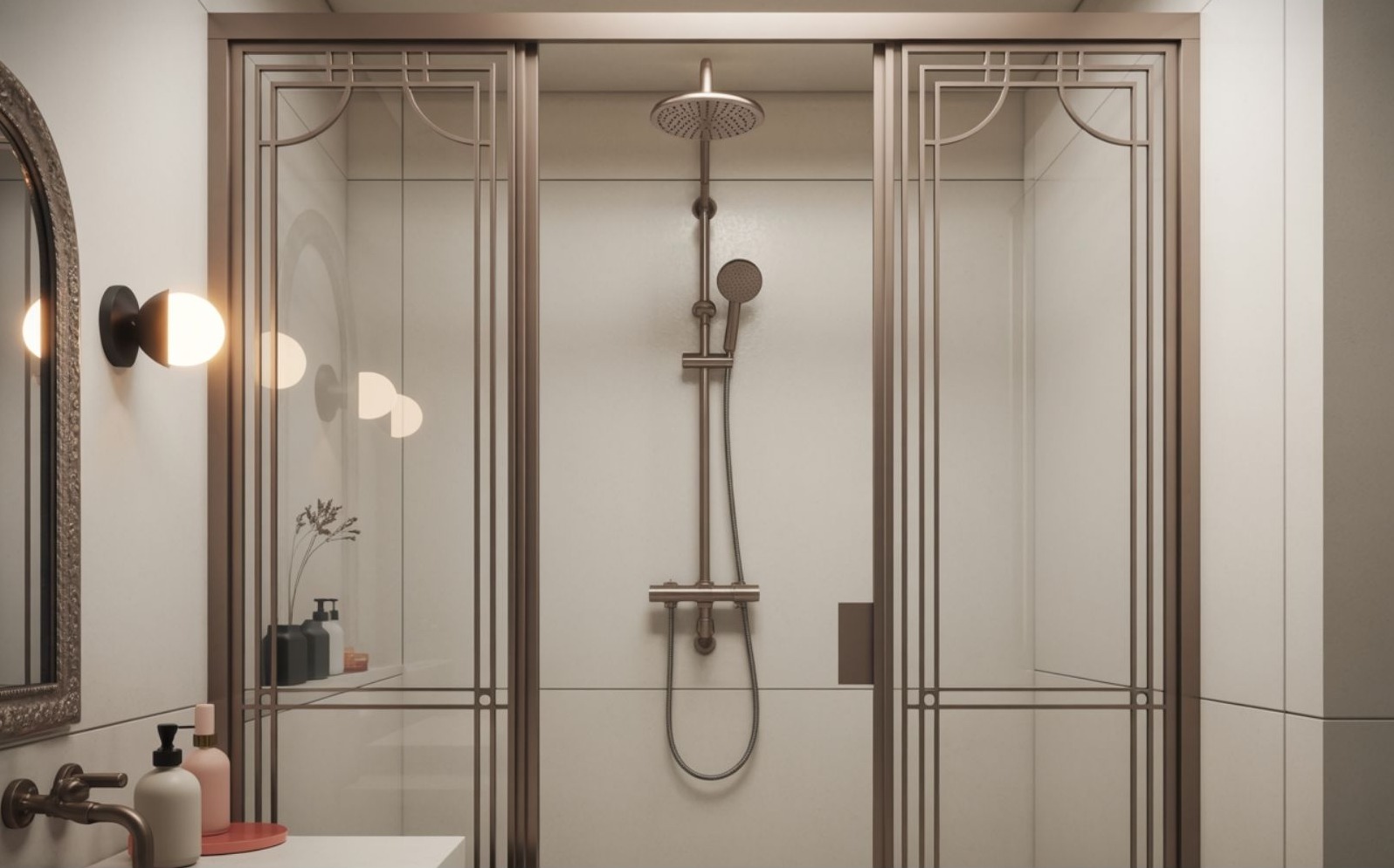 Az art deco és a retró hatás finoman visszatér a fürdőszobákba. A fémkeretes zuhanykabinok – különösen nikkel vagy melegebb fém tónusokban – karakteres fókuszponttá válnak. Ezek a megoldások egyszerre idézik a múlt eleganciáját és a kortárs dizájn tudatosságát.