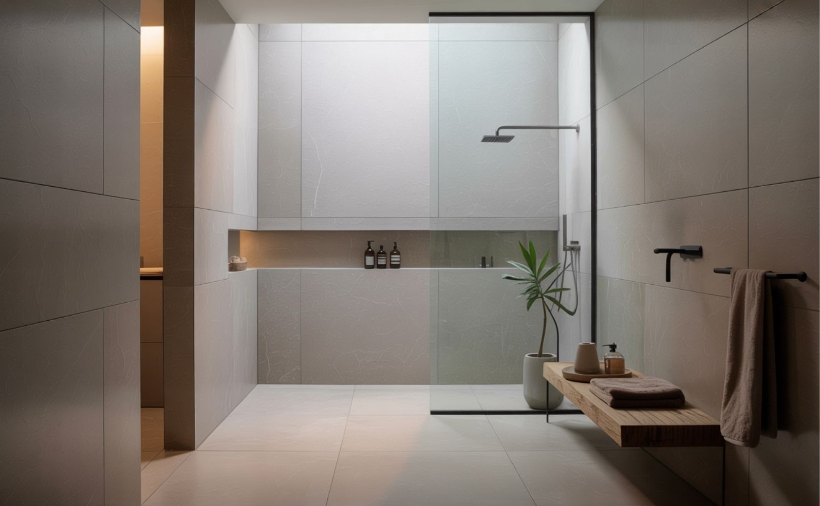 A beépített zuhanyzópad korábban elsősorban kényelmi funkciót töltött be, 2026-ban azonban vizuális hangsúly lesz. Az egyszerű, sarokba illesztett padokat egyre inkább felváltják az egyedi formálású, szoborszerű megoldások. Ezek gyakran természetes kőből, márványból vagy a burkolattal azonos anyagból készülnek, így szinte a tér szerves részévé válnak.