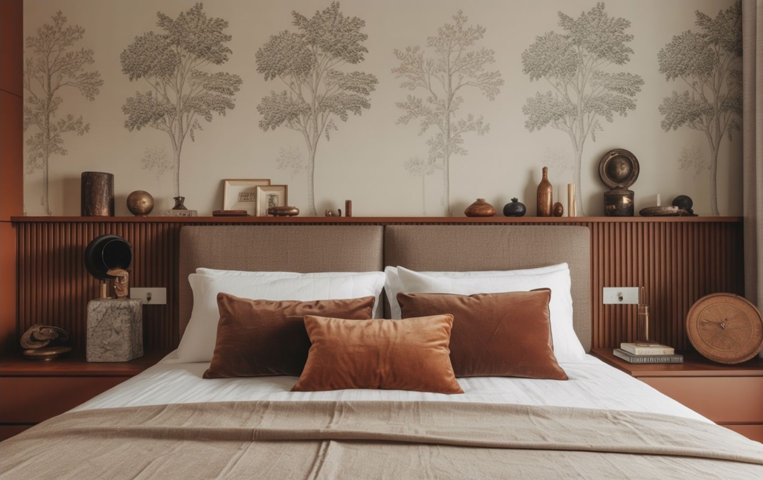 Meglepő módon a nagyobb a jobb elve kisebb hálószobákban is működik. A kulcs itt az egyszerűség. Egyetlen hangsúlyos elem – például egy széles, de nem túl magas fejtámla – sokkal rendezettebbé teszi a teret, mint több apró bútor és dekoráció.