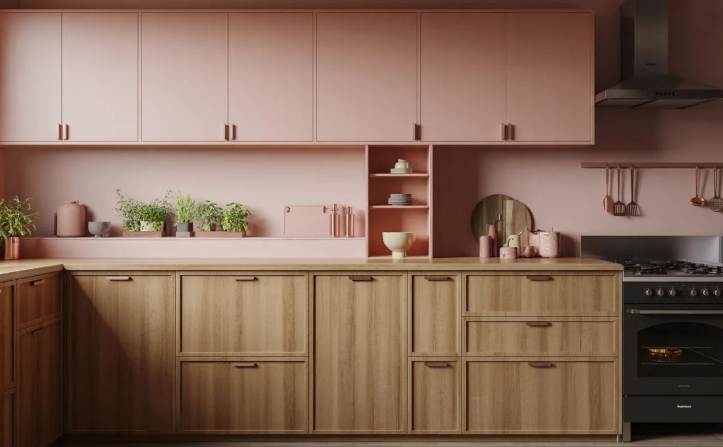 Ezek az árnyalatok meleg fényt adnak a térnek, miközben nem válnak hangsúlyossá. Különösen jól harmonizálnak fával, kővel és matt fémekkel, és képesek finom karaktert adni anélkül, hogy uralnák a konyhát. A rózsaszín ebben az értelmezésben nem trend, hanem hangulat.