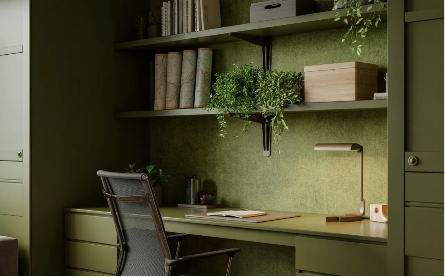 A zsályazöld, az eukaliptusz vagy a hideg olajzöld ilyen környezetben tompává, porossá válik. A falak elnyelik a fényt, a tér sötétebbnek és nehezebbnek hat, mint amilyen valójában. A zöld nem frissít, hanem lehúz.