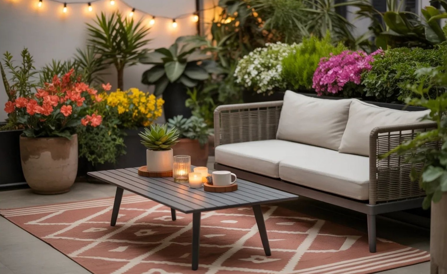 Egy kisebb kanapé, egy alacsony asztal, egy kültéri szőnyeg és egy jól elhelyezett fényforrás már elegendő ahhoz, hogy a tér összeálljon. Nem a mennyiség számít, hanem az, hogy a tárgyak kapcsolatban legyenek egymással. Egy jól szervezett kompozíció még kis alapterületen is tágasabbnak hat.