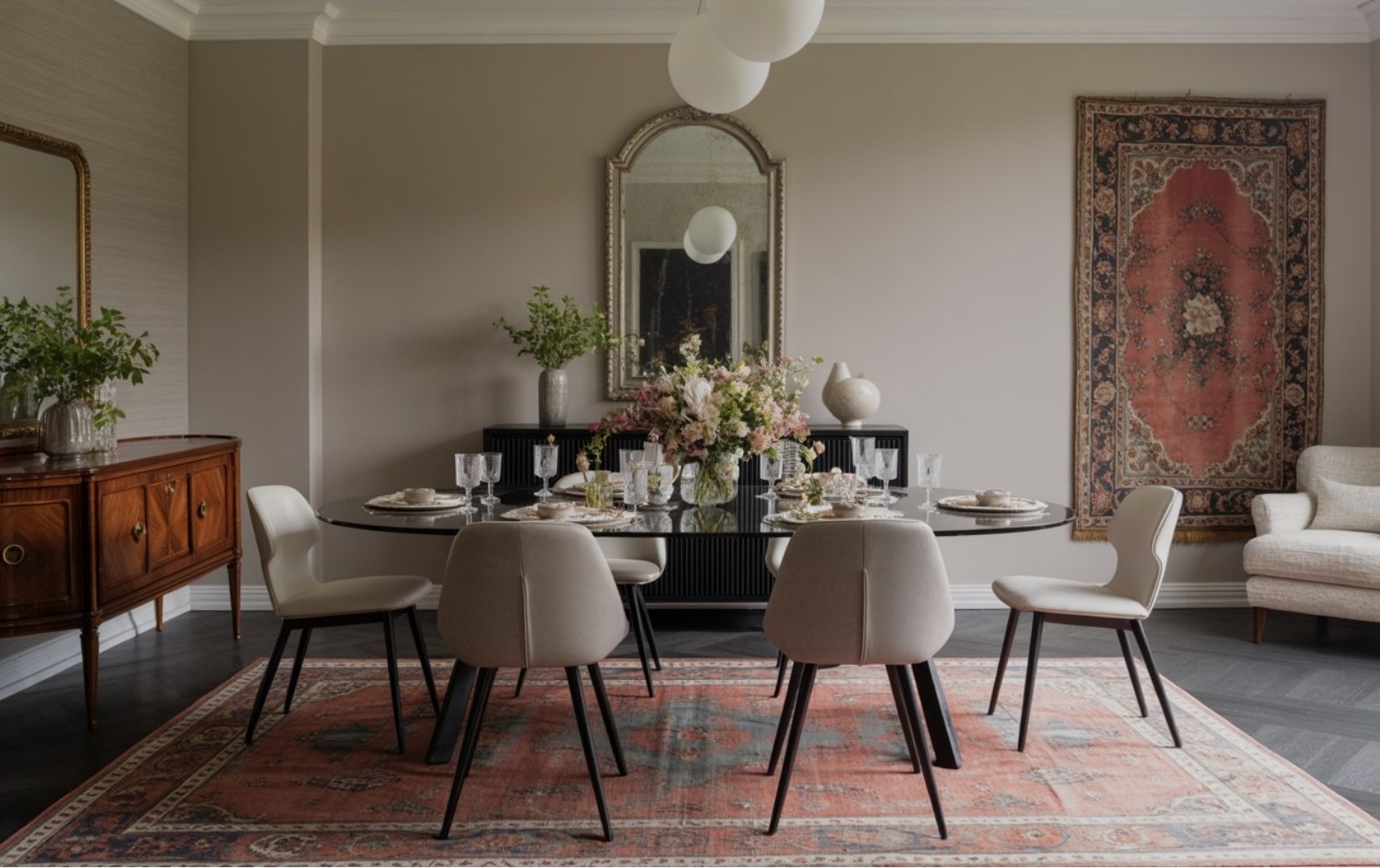 Egy szépen megterített asztal önmagában is látványos. Ha azonban az étkező minden felülete egyszerre akar főszereplő lenni – hangsúlyos tapéta, erős színek, karakteres szőnyeg, feltűnő műalkotás –, az összhatás gyorsan fárasztóvá válik.