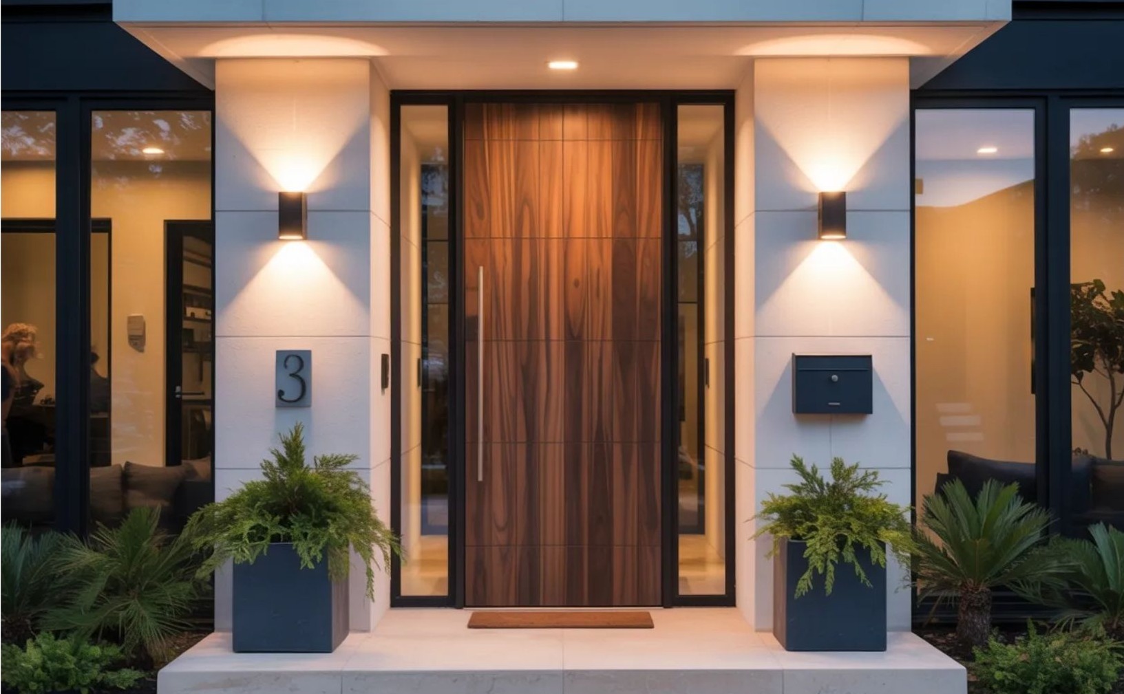 Egy bejárati ajtó mellett elvesző, aránytalan lámpa gyengíti a homlokzat fókuszát. Ezzel szemben egy megfelelő méretű, meleg fényű lámpatest eleganciát és mélységet ad. A rétegzett világítás – bejárati fény, kerti útvonalvilágítás, finom kiemelő spotok – professzionális hatást keltenek.