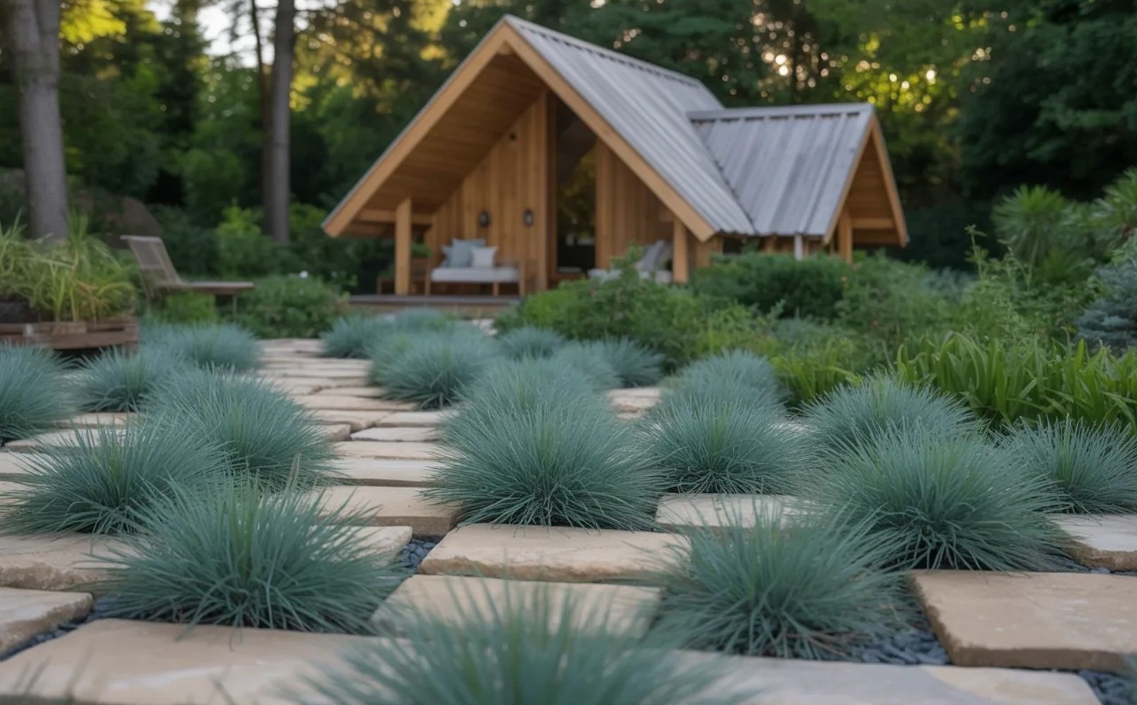 Az alacsony díszfüvek, például a kék csenkesz (Festuca glauca) nem klasszikus fuganövények, de ritkábban rakott térkövek között kifejezetten jól működnek. Könnyed, légies struktúrát adnak a felületnek.