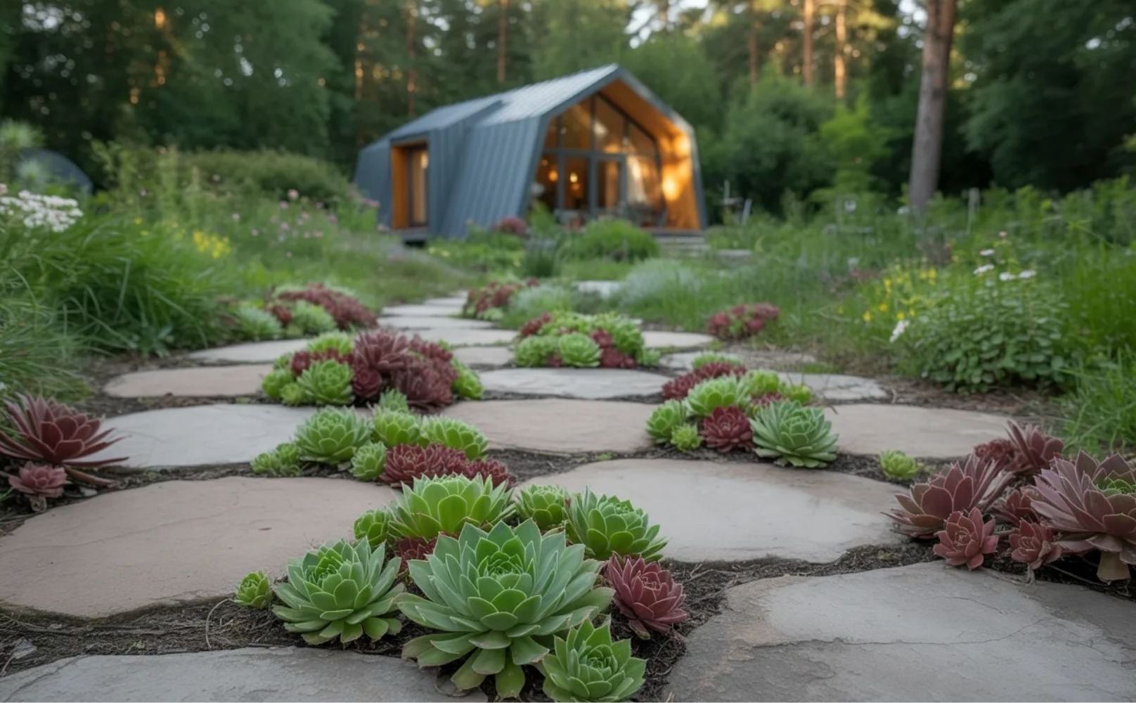 A kövirózsa (Sempervivum) az egyik legellenállóbb választás. Kevés földben is megél, jól bírja a hőséget és a hideget is. Strukturális, kissé szoborszerű hatást ad a térkövek között.