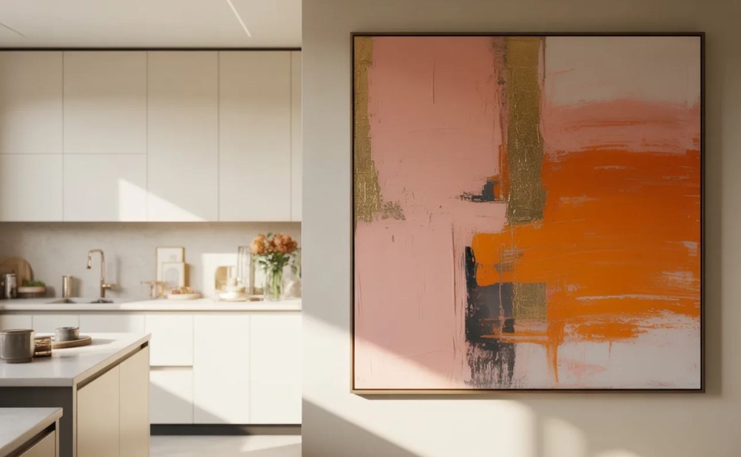 A műalkotások finoman emelik a konyha státuszát: nem csak funkcionális helyiségként, hanem valódi élettérként kezelik.