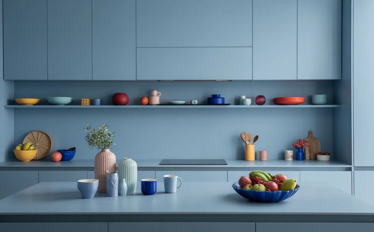 Ezek a tárgyak nem puszta dekorációk: használatban vannak, mégis személyes történetet mesélnek. A szín így nem rákerül a konyhára, hanem természetesen belenő.