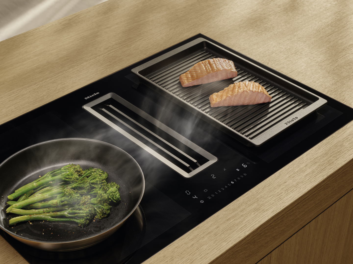 A főzés közbeni komfort nemcsak az ételről szól, hanem a tér minőségéről is. A Miele pultba süllyesztett downdraft páraelszívó automatikusan az ideális pozícióba emelkedik, és a Con@ctivity technológia révén összehangoltan működik a főzőlappal. A szellőztetés teljesítménye a főzés intenzitásához igazodik, így a levegő friss marad anélkül, hogy manuális beavatkozásra lenne szükség. A főzőlap gyors reakcióideje pontos hőszabályozást tesz lehetővé, miközben a felület könnyen tisztán tartható és vizuálisan egységes marad.