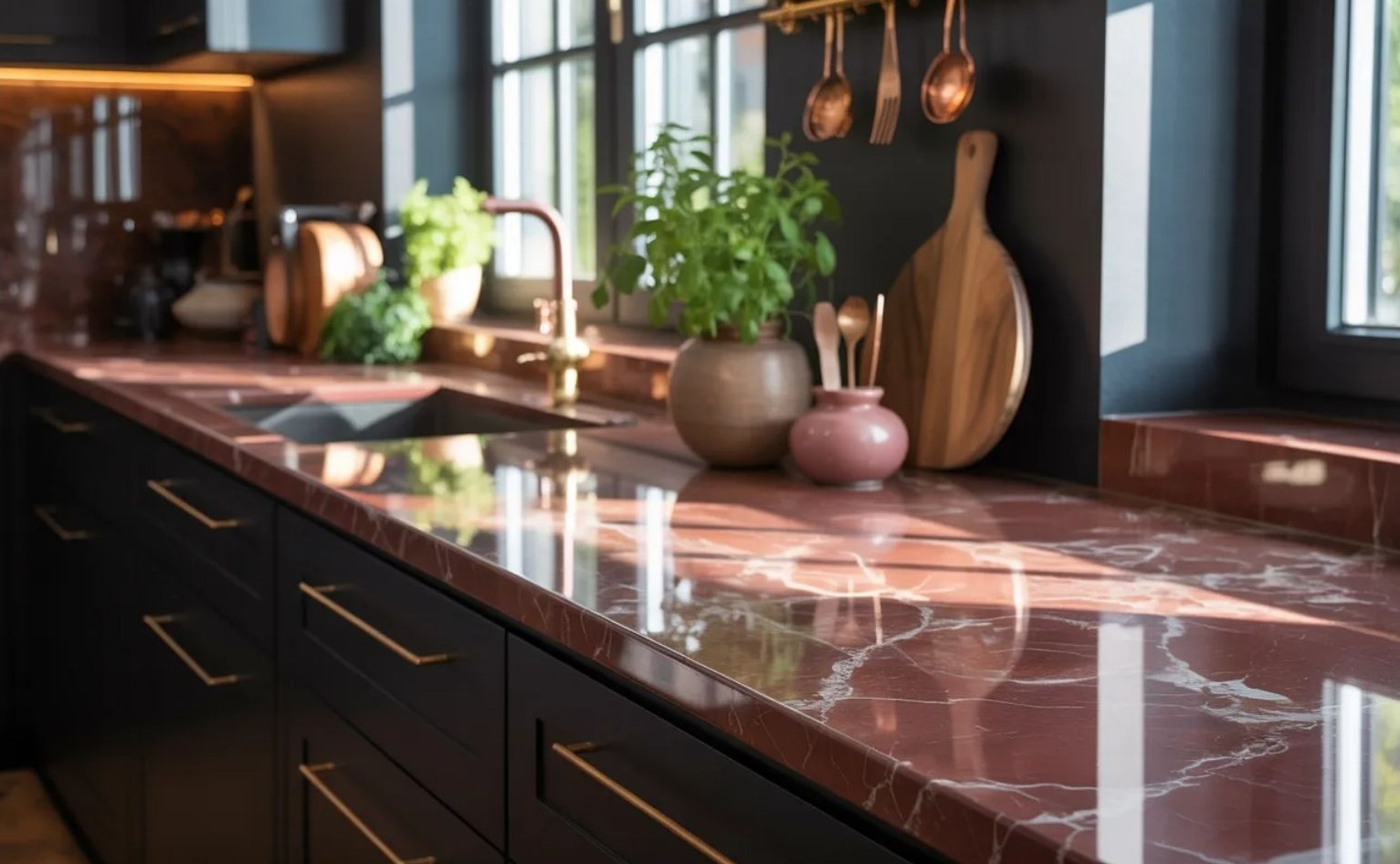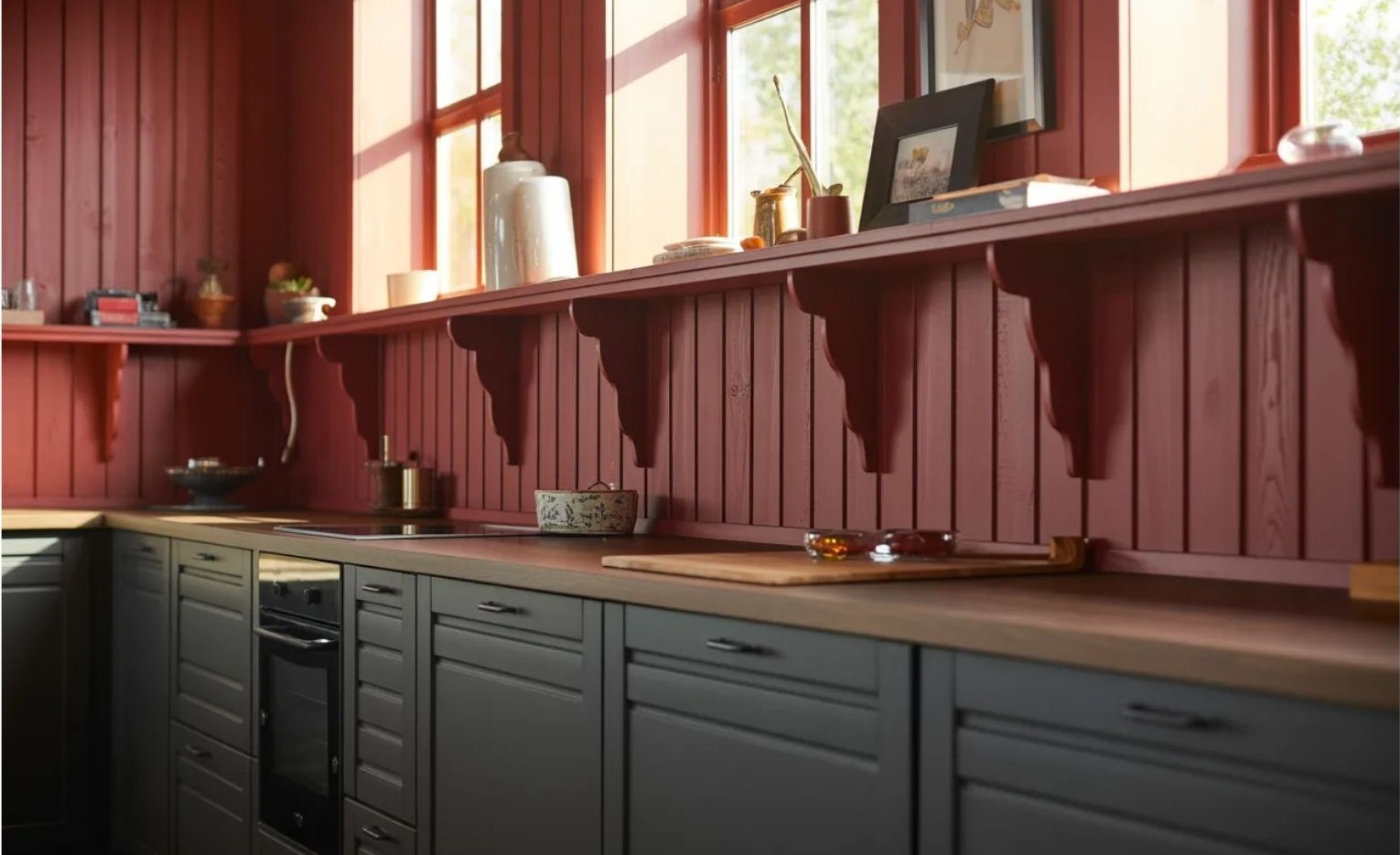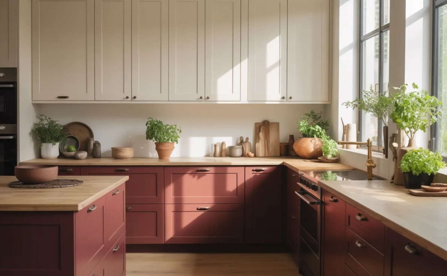 A bordó árnyalatok ritkán borítják be az egész konyhát. Inkább alsó szekrényeken, konyhaszigeten vagy hangsúlyos felületeken jelennek meg, miközben a többi elem világosabb vagy természetes marad.