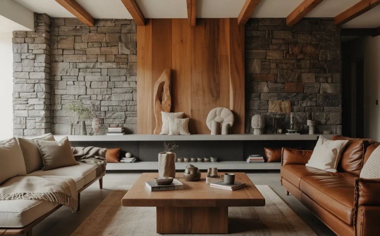 A kő és a tömör fa stabilitást sugároz. Egy kőburkolat, masszív faasztal vagy látható gerenda mélységet ad a térnek.