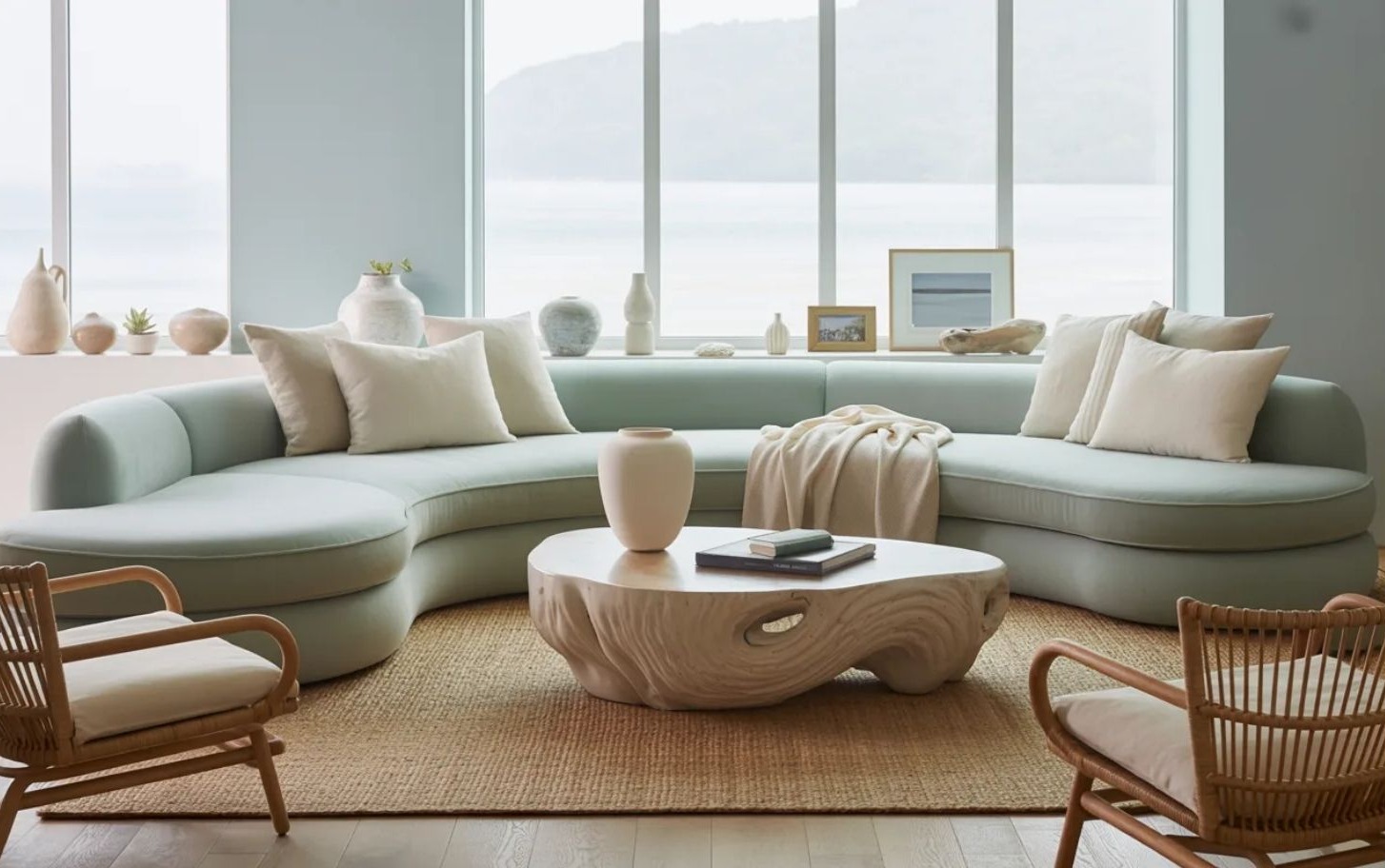 A lágy kékek, ködös zöldek, tengeri hab árnyalatok és meleg fehérek vizuálisan tágítják a teret. Ezek a színek lélegeztetik a szobát.