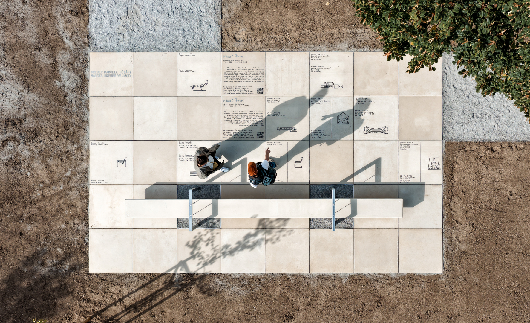 A pad nem pusztán emlékmű, hanem funkcionális design objektum – méltó a funkcionalizmus mesteréhez. Az acélkeretben lebegő betonfelület a nehéz könnyűség elvét idézi meg, miközben szimbolikusan összeköti a múltat és a jelent. A pad köré helyezett információs járólapokon Breuer legfontosabb tárgyai és épületei láthatók, így a járókelők szó szerint az örökségére lépnek.