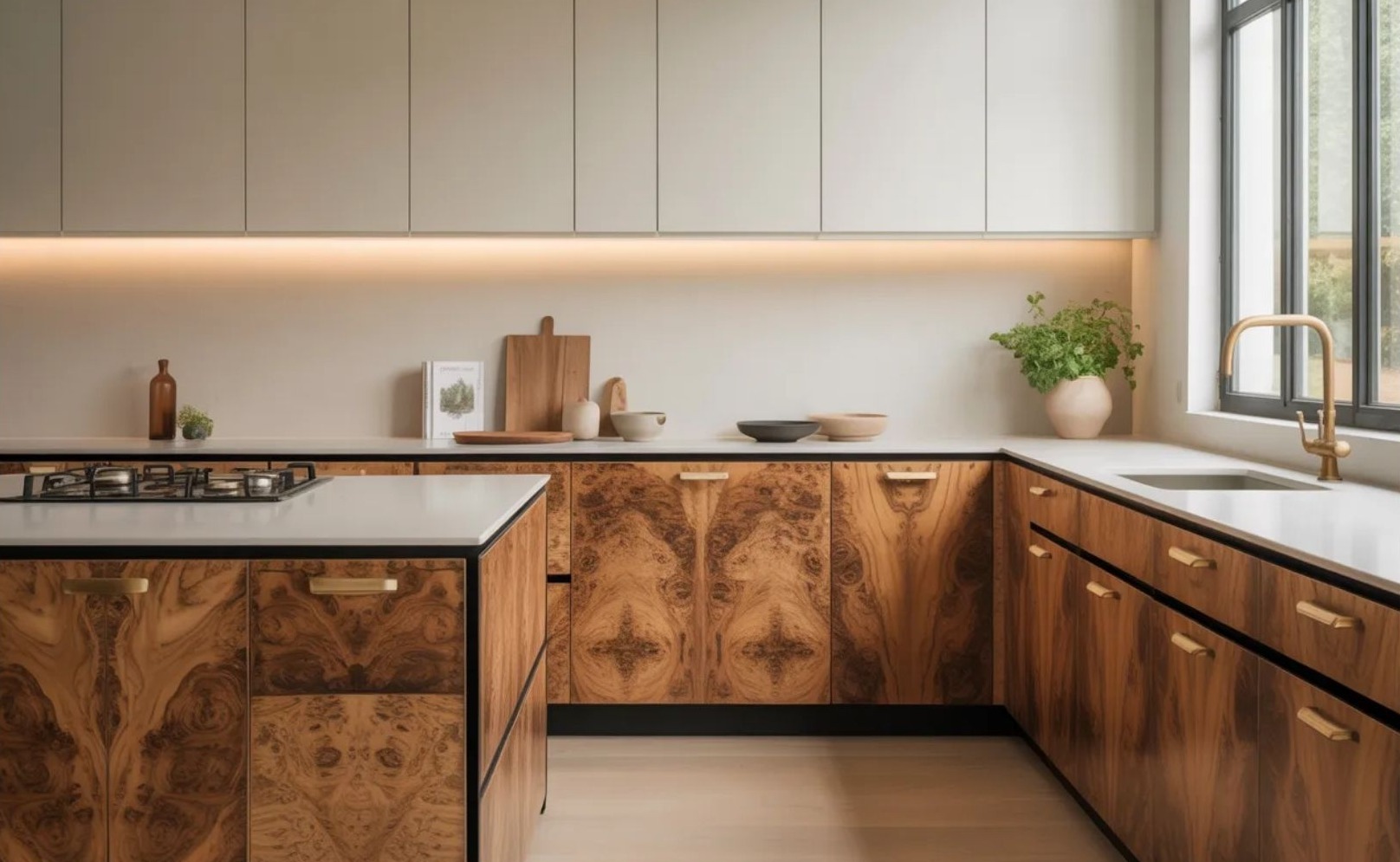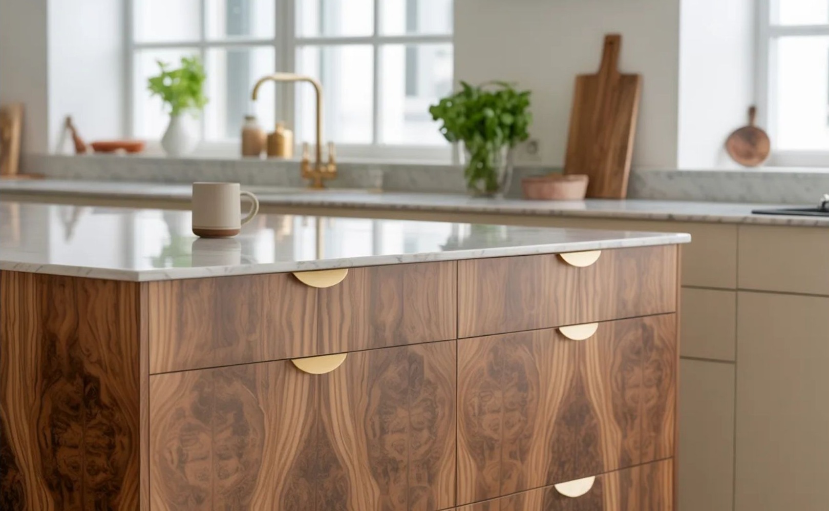 Egy gyökérfa burkolatú konyhasziget például szinte bútordarabként működik a térben, nem egyszerű felületként. Ez a fajta alkalmazás lehetővé teszi, hogy a különleges mintázat érvényesüljön, anélkül hogy túlterhelné a teret.