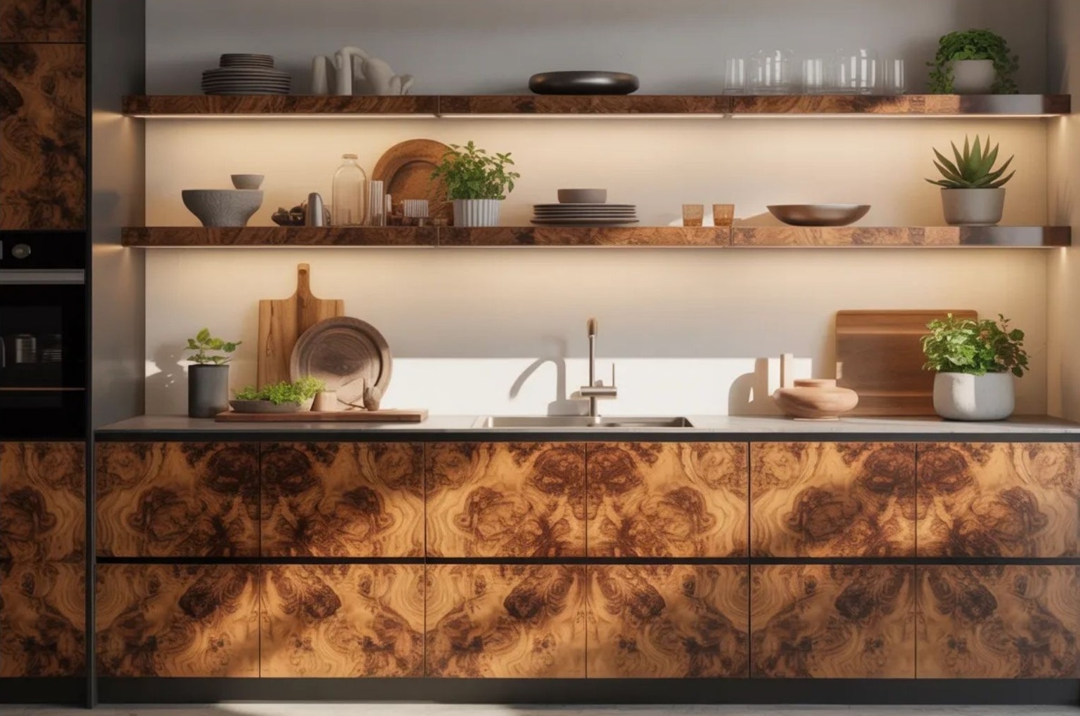 A burl wood, azaz gyökérfa pontosan ezt kínálja. A mintás fa front nem harsány, de jelenléte erős. Természetes melegséget visz a térbe, miközben vizuális fókuszt teremt. A modern luxus ma már nem a csillogásról, hanem az anyag minőségéről és egyediségéről szól. Egy ilyen felület azonnal személyiséget ad a konyhabútornak.