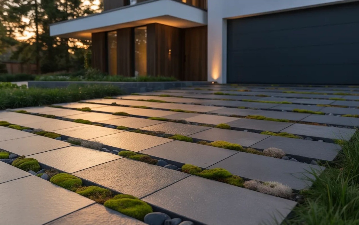 Moduláris beton- és kőlapok esetében a hézagok biztosítják a vízelvezetést, letisztult, modern hatást keltve.
