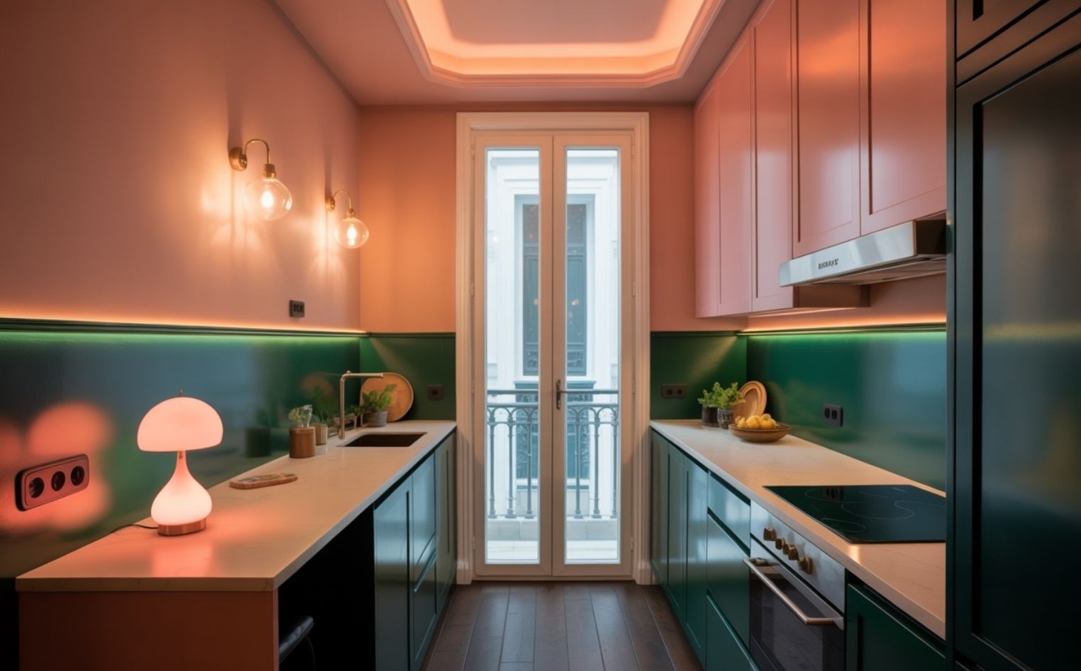 A hátlap nélküli galley konyhákban a világítás adja meg a tér határait: a fényrétegek (mennyezeti-, fali-, asztali lámpák) együttesen helyettesítik a korábbi vizuális elemeket, miközben modern, letisztult és melegebb összhatást keltenek. A végeredmény: egy praktikus, otthonos és karakteres konyha, ahol a fény szó szerint életet visz a falak közé.