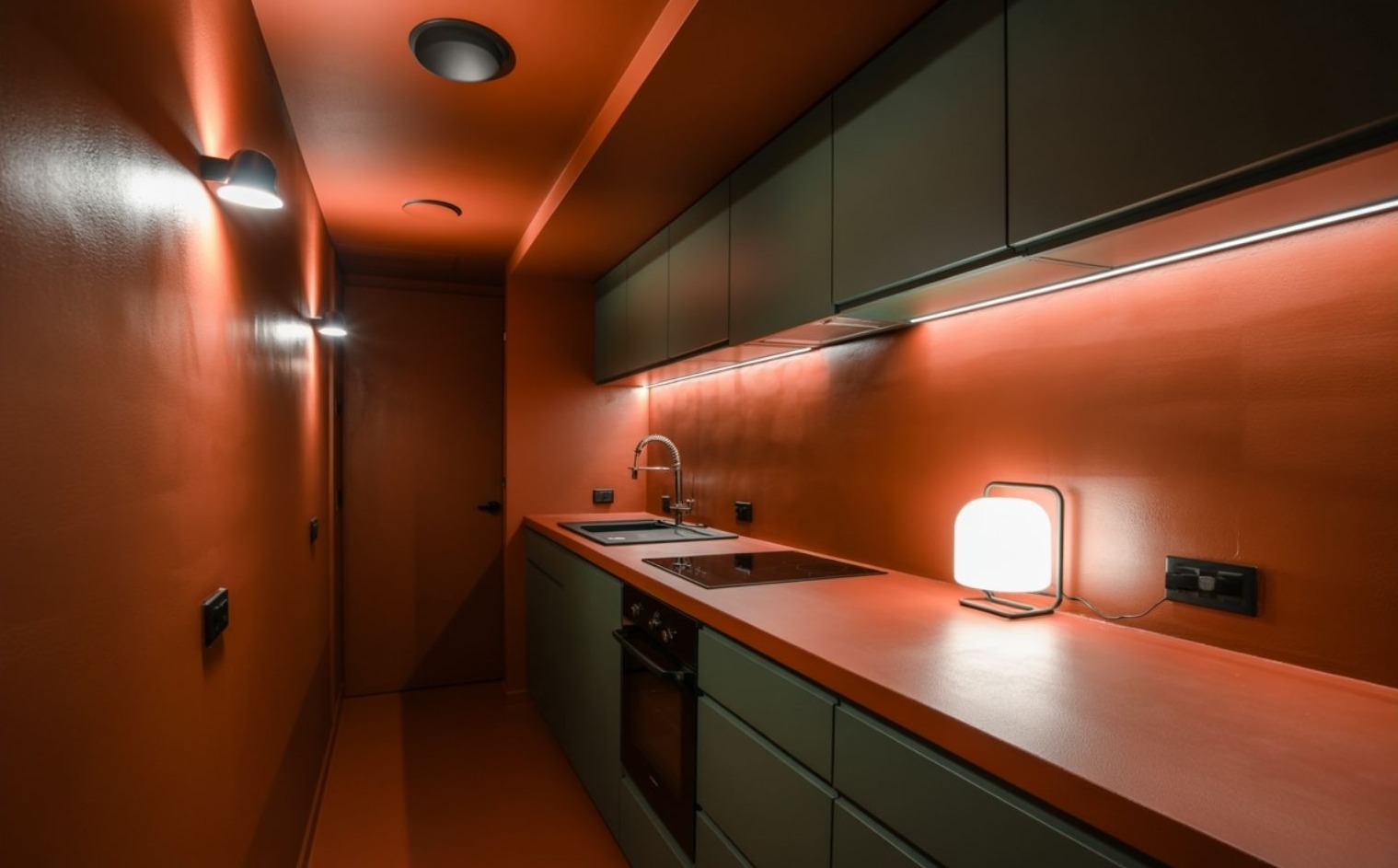 Egy galley konyha világításának alapja a mennyezeti megvilágítás, ami segít a hosszú, zárt tér vizuális megnyitásában. Ezekben a konyhákban a fény és az árnyék folyamatos versenyben áll. Egy erős, mégis egyenletes fény biztosítja, hogy a tér funkcionális maradjon, és ne érezzük nyomasztónak.