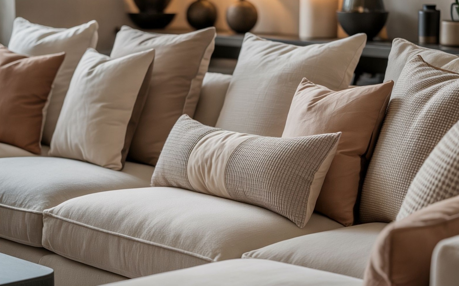 Egy igazán stílusos kanapé sosem teljesen szimmetrikus. A különböző méretű és formájú párnák tudatos elrendezése adja meg a dinamizmust. Nagy párnák hátul, kisebbek elöl, középen egy deréktámasz vagy hengerpárna – ez az a struktúra, amit a belsőépítészek előszeretettel használnak.