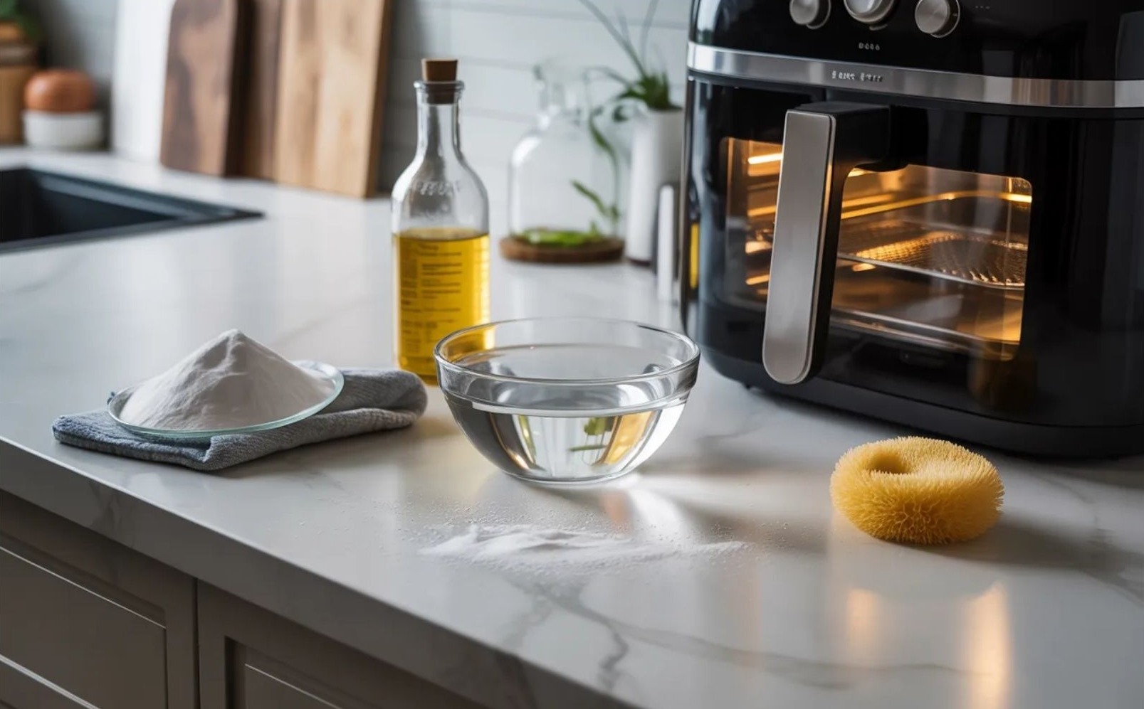A készülék belsejéhez készíts szódabikarbónás pasztát egy kevés víz hozzáadásával. Ezt óvatosan vidd fel a zsíros felületekre, de ügyelj arra, hogy ne kerüljön közvetlenül a fűtőelemekre. Hagyd hatni legalább tíz–húsz percig, erősebb szennyeződés esetén akár tovább is.