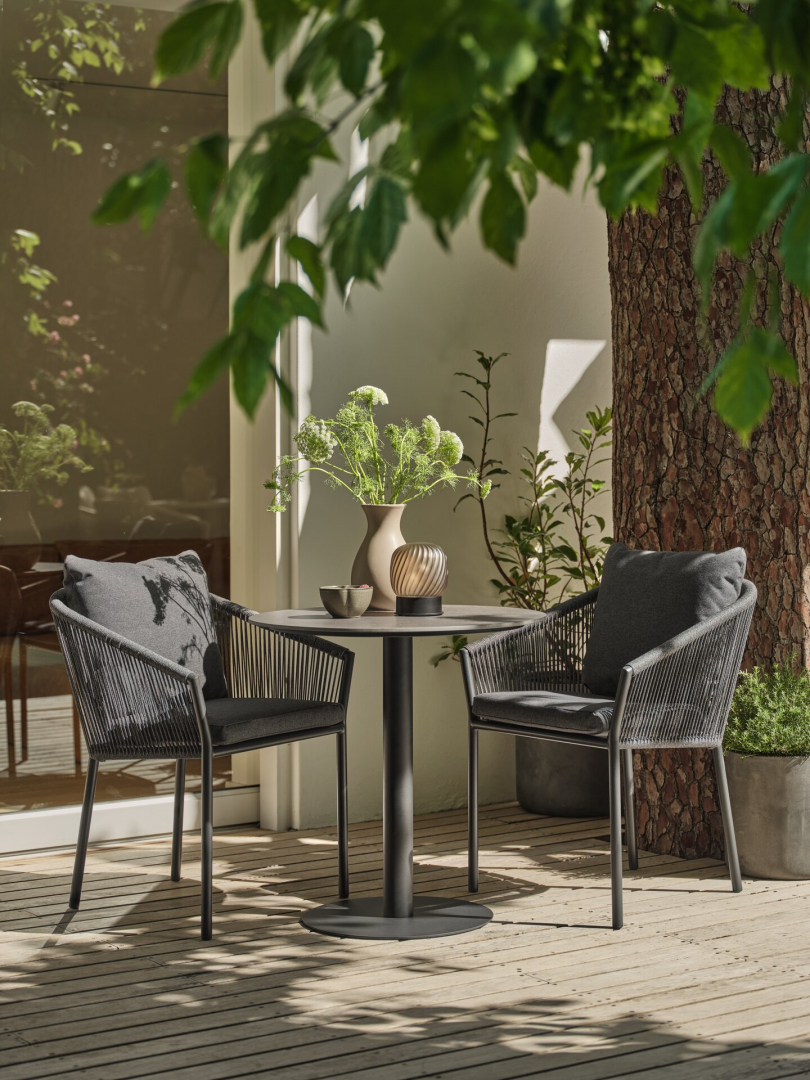Két személyre terítenél? Egy kerek asztal porfestett kőlappal és két kényelmes, rakásolható szék luxusminőségű párnázattal tökéletes kombinációt alkot, így még a legkisebb helyből is kihozhatod a legtöbbet