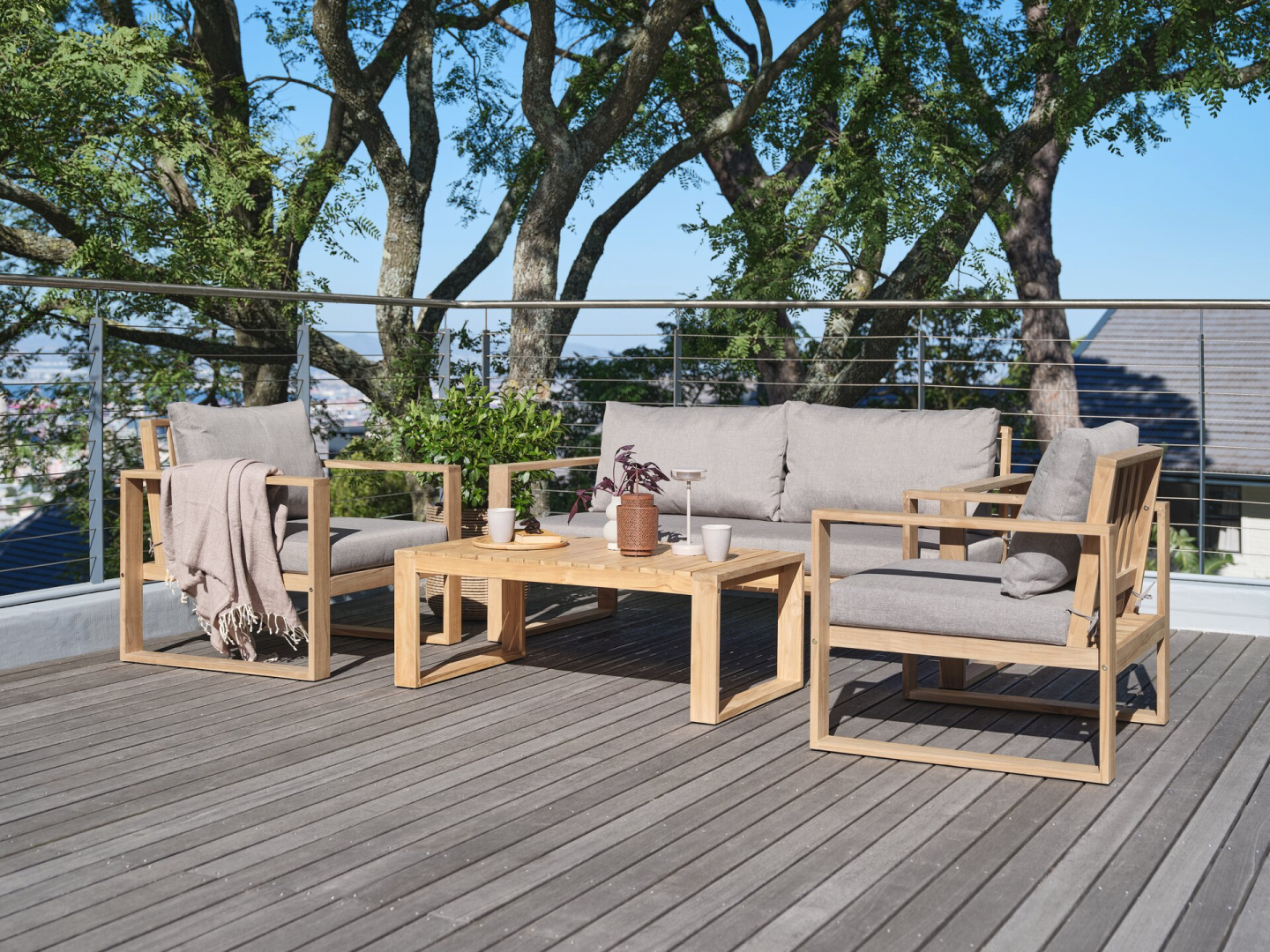 Időjárásálló, masszív és gyönyörű, ezért a teakfa mindig kiváló választás, különösen, ha természetes szépségét időtálló karakterrel ötvözzük. Kanapé, két párnázott fotel és egy asztal teszi a kertet a második nappalivá.