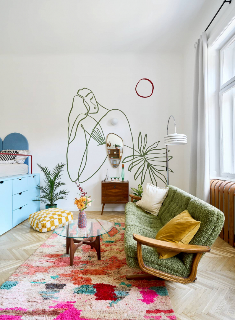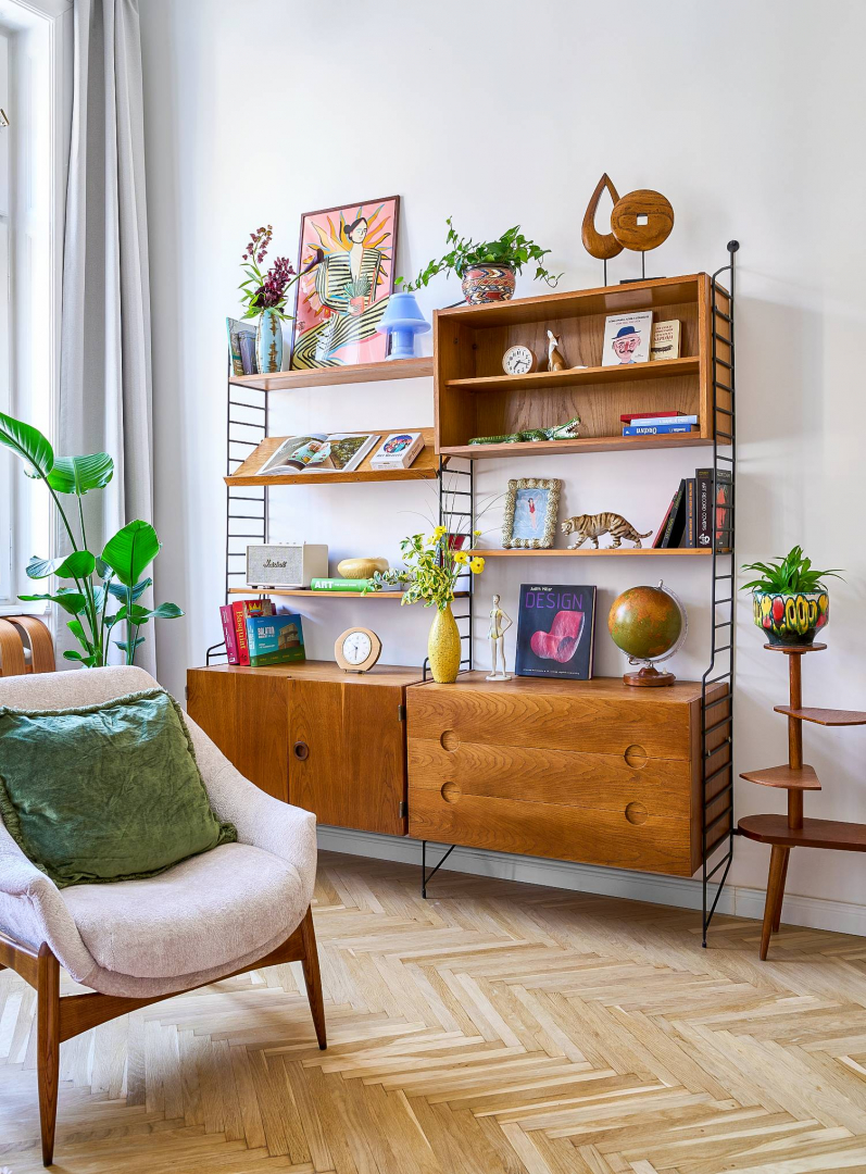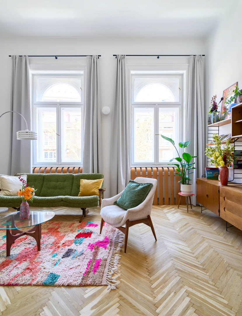A belső tér ereje nemcsak a merész színkombinációkban rejlik, hanem a humorral és vizuális intelligenciával összeállított tárgyegyüttesben is. Grafikák, illusztrációk, személyes részletek rétegezik a látványt, ami egyszerre energikus és otthonos. Nem véletlen, hogy a projektet az ELLE Decoration Hungary főszerkesztője, Osvárt Judit is úgy jellemezte: ritka példa arra, hogyan lehet kicsi alapterületen tágas, izgalmas és bőséges tárolással rendelkező enteriőrt létrehozni – szinte teljes egészében vintage darabokból.