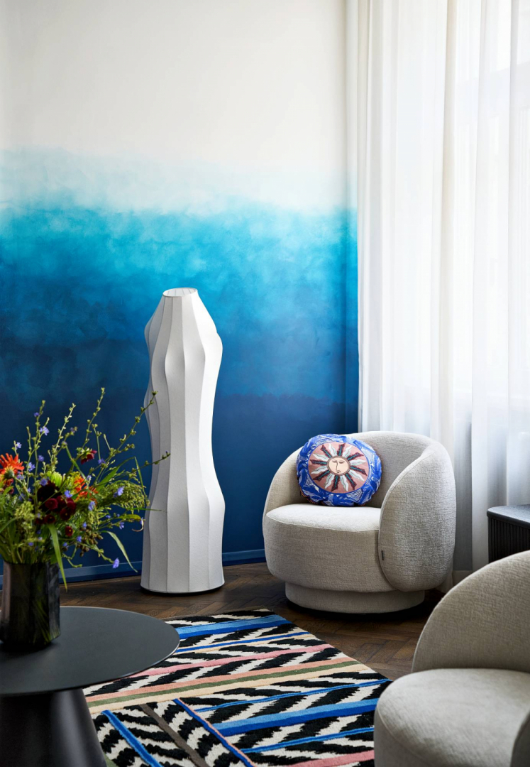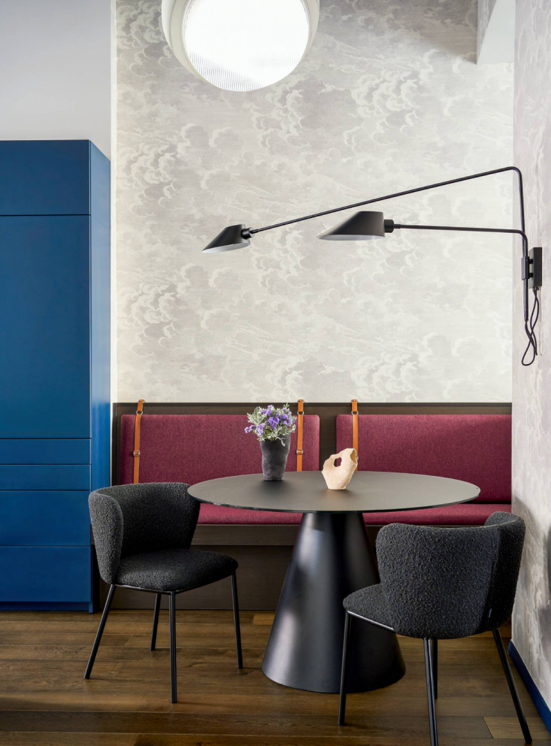 A tervezők – Hadnagy Tímea, Timmer Dániel és Gerse Dalma – megőrizték az eredeti, nagypolgári térszerkezet legfontosabb elemeit, köztük a látványos kétszárnyú ajtókat, miközben markáns, kortárs beavatkozásokkal frissítették az enteriőrt. A tengerkék árnyalatokkal festett falak és ajtók erős vizuális alapot adnak, amit fémes felületek, üvegezett átlátások és tudatosan kiválasztott világítótestek egészítenek ki.