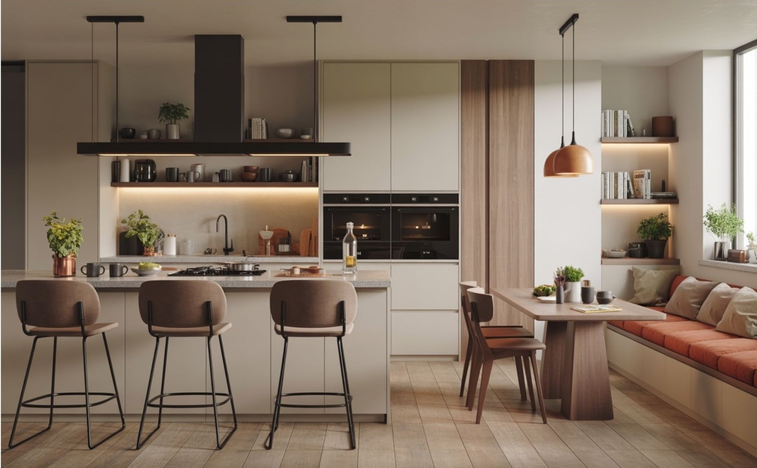 A puha itt nem azt jelenti, hogy minden textilből van, hanem azt, hogy a tér nem taszít, hanem hív. Nem sürget, hanem maradásra ösztönöz. Egy olyan konyháról van szó, ami már nem áll élesen szemben a nappalival, hanem szinte észrevétlenül olvad bele.