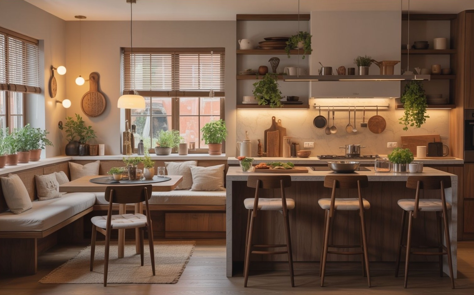 Ebben fontos szerepe van az ülőhelyeknek: nemcsak a klasszikus bárszékeknek, hanem kényelmesebb székeknek, padoknak, sőt akár egy kisebb étkezősaroknak is. A cél az, hogy főzés közben se váljunk el a többiektől, és a vendégek se érezzék azt, hogy útban vannak.