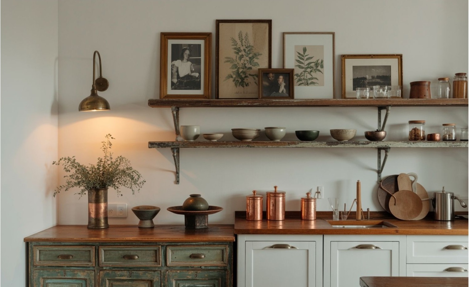 Ez nem véletlenszerű gyűjtögetés — inkább tudatos rétegzés, ami személyességet és mélységet visz a térbe. A vintage és a modern kombinációja 2026-ban az egyik legidőtállóbb konyhai stílus.