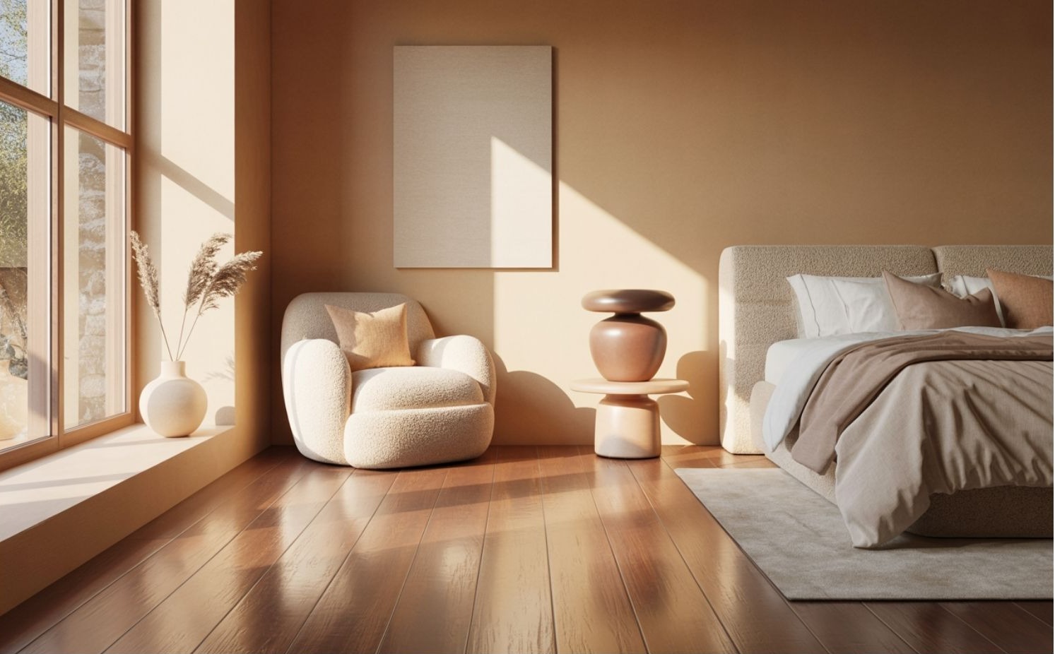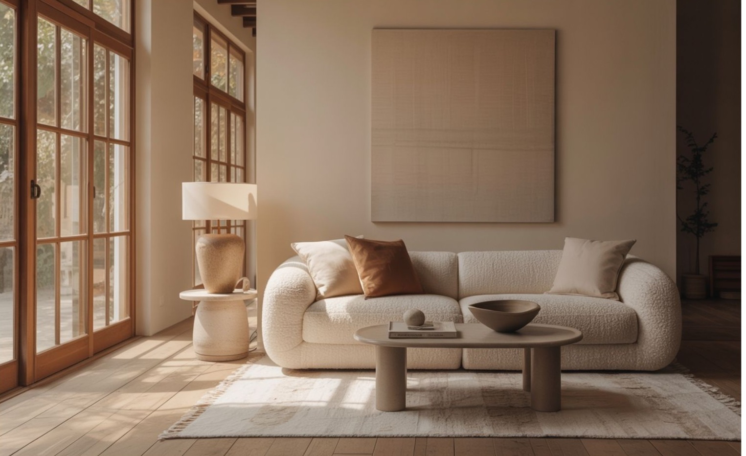 Az új Japandi enteriőrök barátságosabbak, melegebbek és személyesebbek, mint valaha. A színpaletta a fehér és szürke helyett mézszínű bézsekre, agyagtónusokra, krémszínre és puha barnákra épül. A világos fapadlók, a szőtt textilek és a puha fények együttese azt az érzést kelti, mintha mindig aranyló délutáni fényben úszna a tér.
