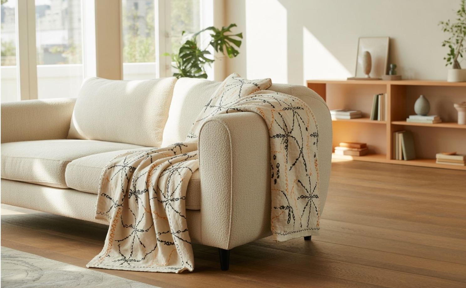 A díszítés finom és tudatos – egy puha bouclé kanapé, egy matt kerámia lámpa vagy egy semleges tónusú vászonkép adja a karaktert. A kiegészítőkből kevés akad, de mind jelentéssel bírnak. Nem a rendetlenség, hanem az élet jelenléte adja a harmóniát.