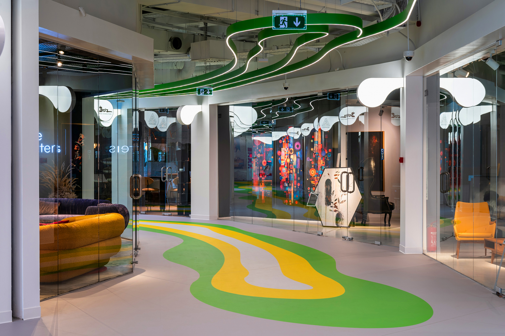 A fluid formák és a karakteres színkódok végigkísérik az épület mindhárom szintjét, vizuálisan is segítve a tájékozódást. A bejárattól a közösségi tereken át egészen a megújult mosdókig minden részletben megjelenik Karim játékos, mégis átgondolt világa. A MaxCity valódi „város a városban” élményt nyújt – ezt erősítik az új, formatervezett cégérek, a különleges világítási megoldások, valamint a KARE x Karim kollaboráció keretében beépített lámpák is.
