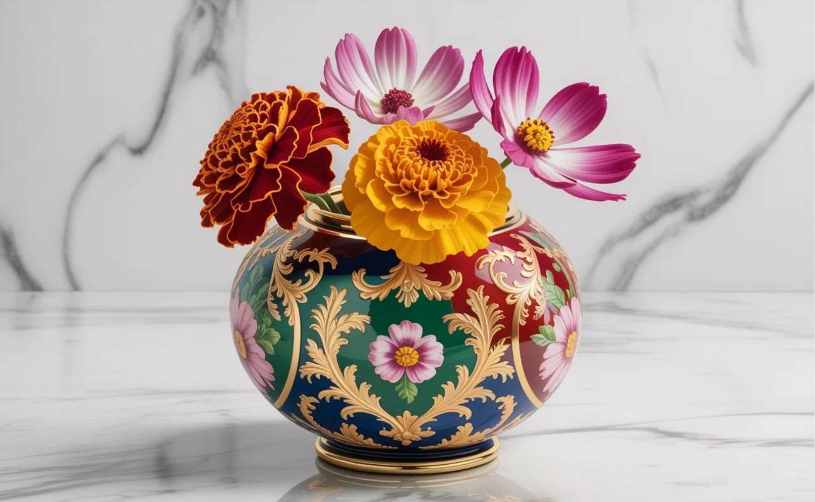 Az bársonyvirág (marigold) és pillangóvirág (cosmos) teltebb, melegebb árnyalatokat hoznak. Egy októberi virágcsokor kifejezetten hangulatteremtő, szinte betölti a teret.
