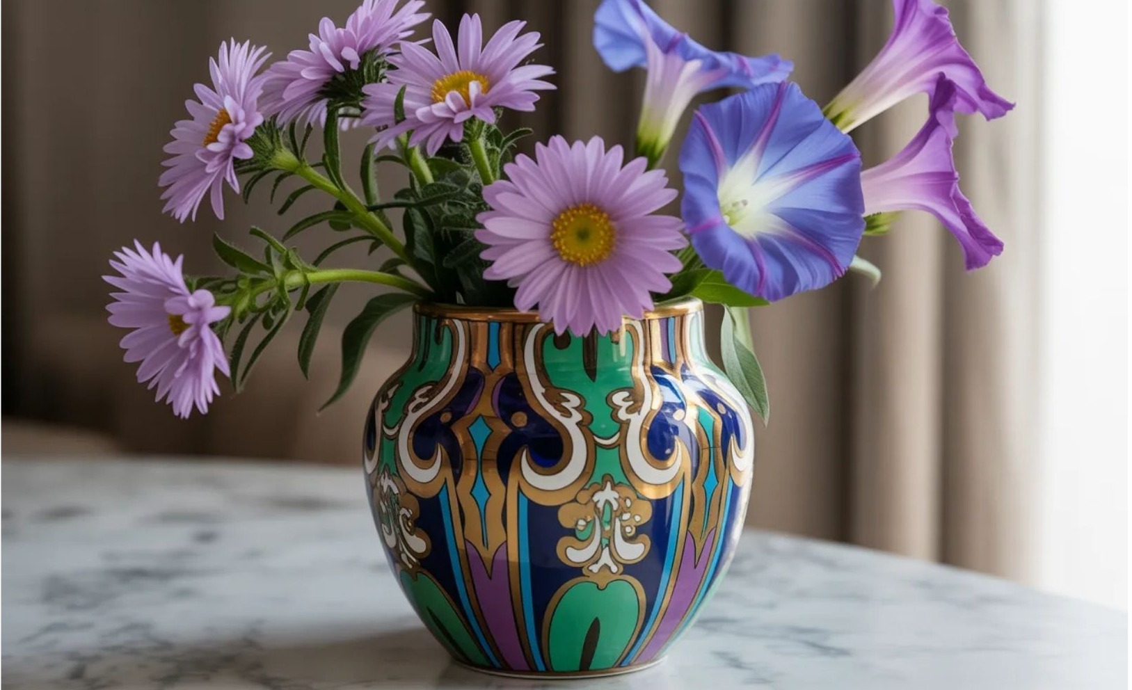 Az őszirózsa (aster) és hajnalka (morning glory) finomabb, átgondoltabb világot képviselnek. Egy ilyen csokor nem azonnal hat, hanem lassan bontakozik ki.