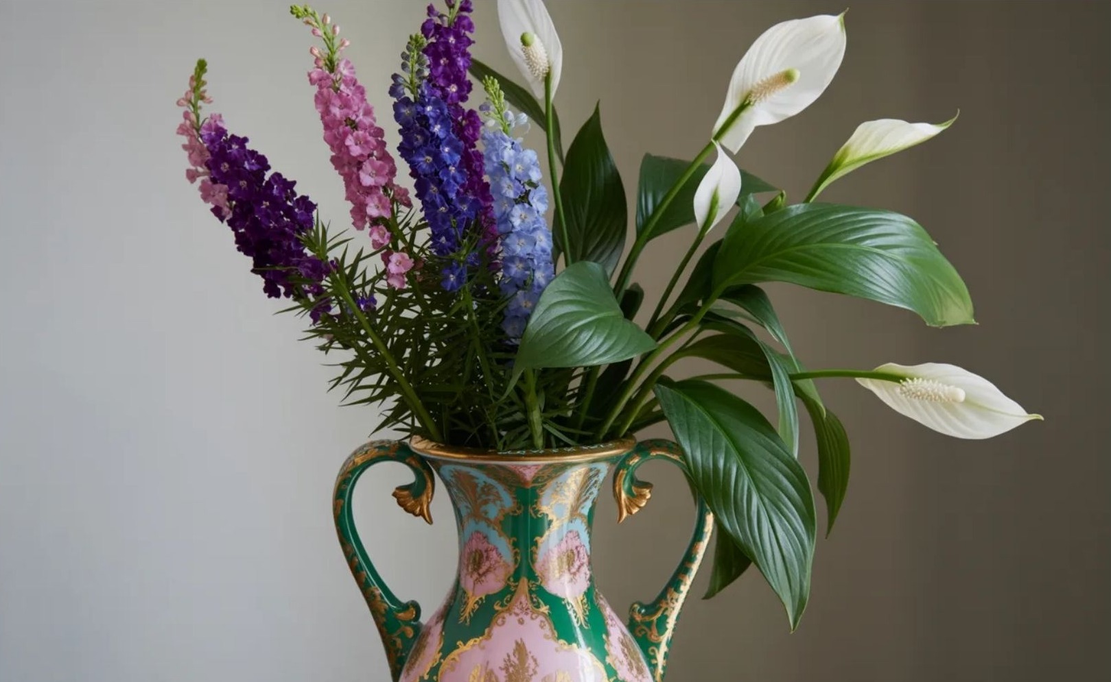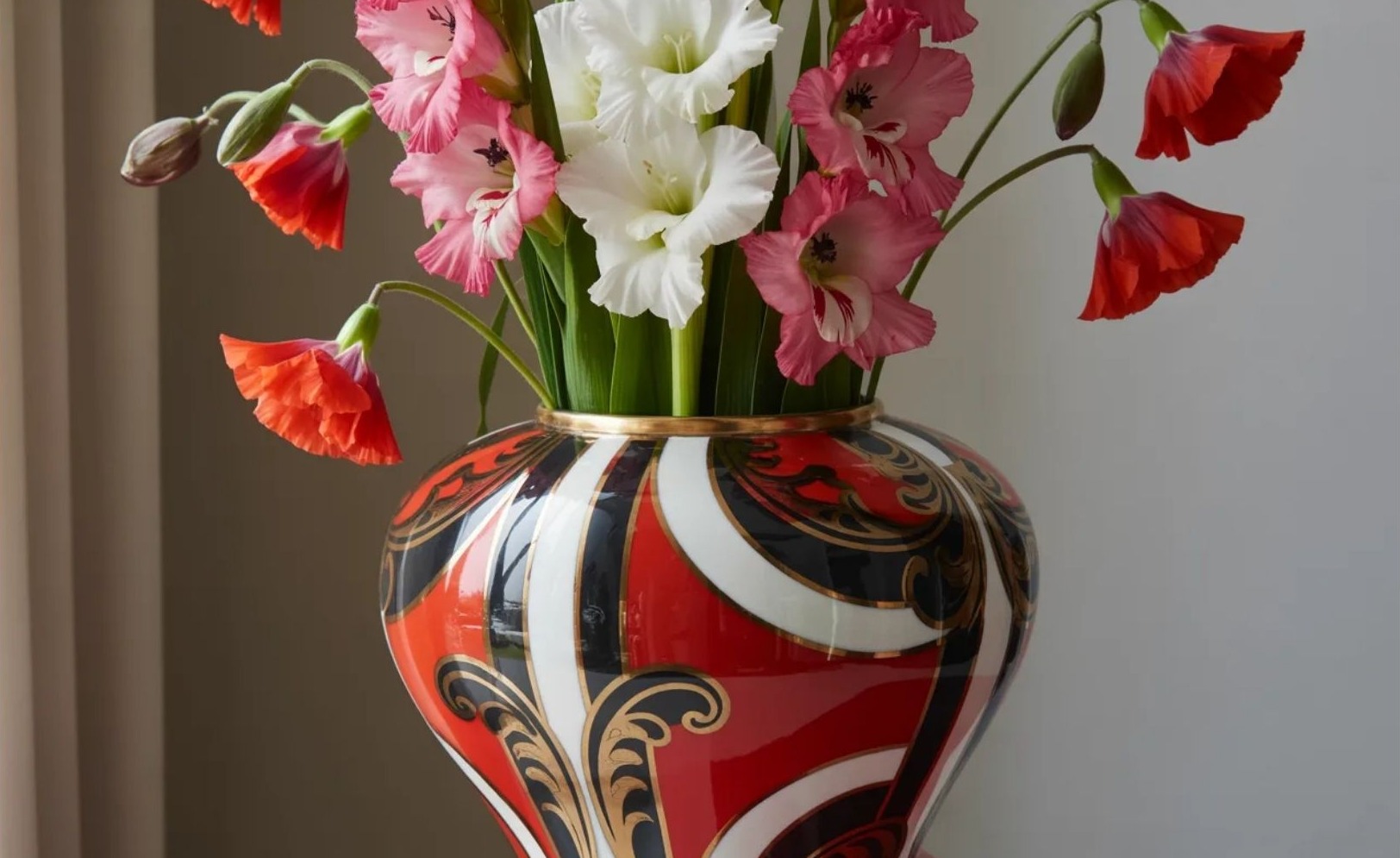 Az kardvirág (gladiolus) és pipacs (poppy) erőteljesebb, határozottabb hatást keltenek. Egy ilyen összeállítás nem marad észrevétlen, mégsem válik túlzóvá.