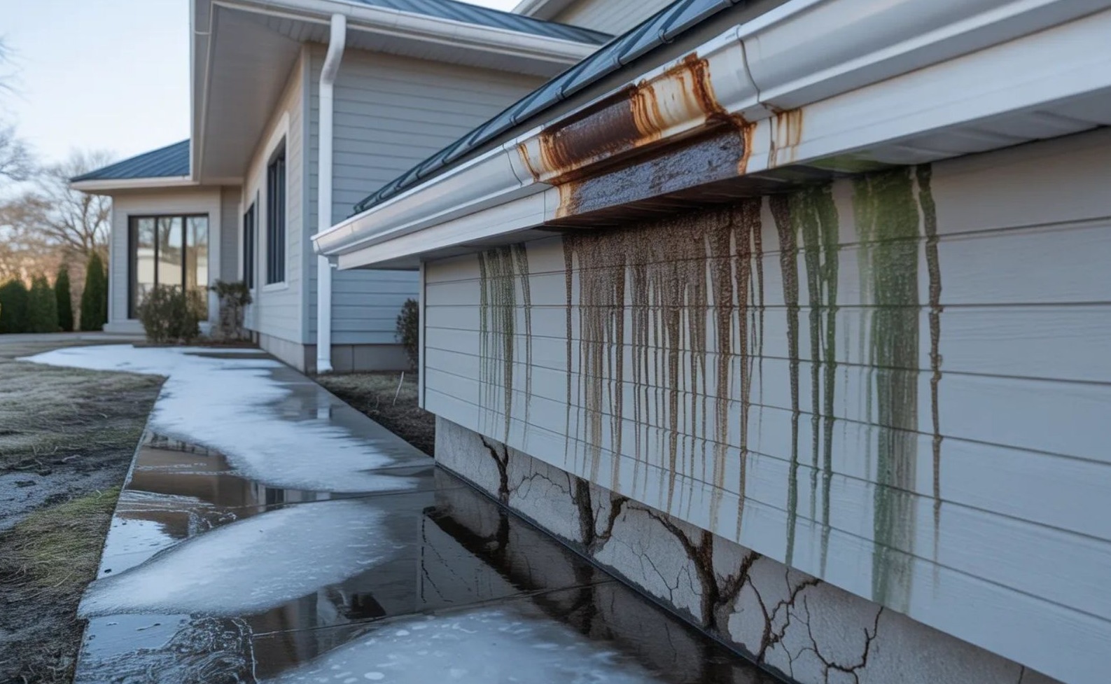 A túlcsorduló víz gyakran közvetlenül az alap mellé folyik, ahol megfagy, majd újra felolvad. Ez az egyik leggyakoribb oka az alaprepedéseknek és a pincefalak nedvesedésének.