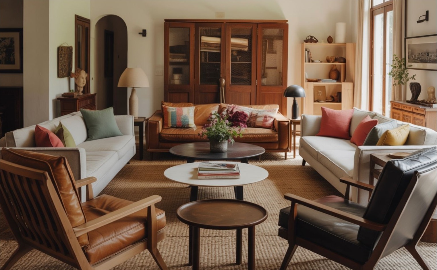 Az egyik leglátványosabb változás, hogy a bútorok elfordulnak a falaktól – és egymás felé kezdenek nézni. A klasszikus, lineáris nappali-elrendezés helyét köríves, párbeszédre ösztönző felállások veszik át. Kanapé kanapéval szemben, fotelek enyhén befordítva, alacsony asztalok középen – úgy, hogy senki ne maradjon kívül a térből.