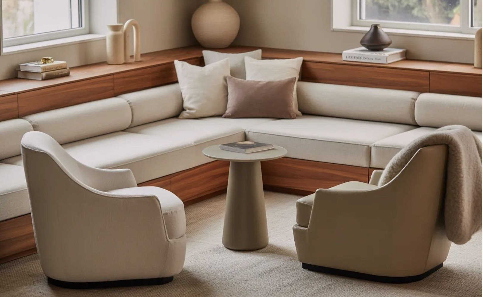 A tervezők szerint az ilyen sarkok különösen jól működnek nagy nappalikban, ahol a tér könnyen túl formálisnak vagy üresnek tűnhet. Egy kisebb ülőhely azonban azonnal emberléptékűbbé teszi a környezetet, és sokkal barátságosabb hangulatot teremt.