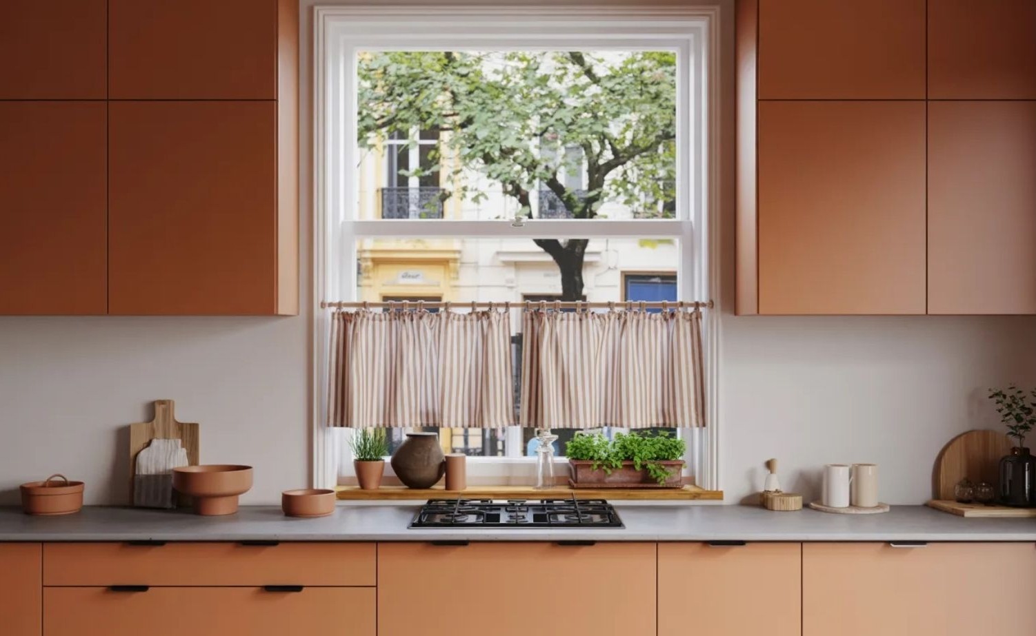A félmagasságig érő kávézófüggöny jó kompromisszum: beengedi a fényt, mégis ad egyfajta intimitást. A lágy textil árnyékjátéka melegebbé teszi a konyhát anélkül, hogy elnehezítené.