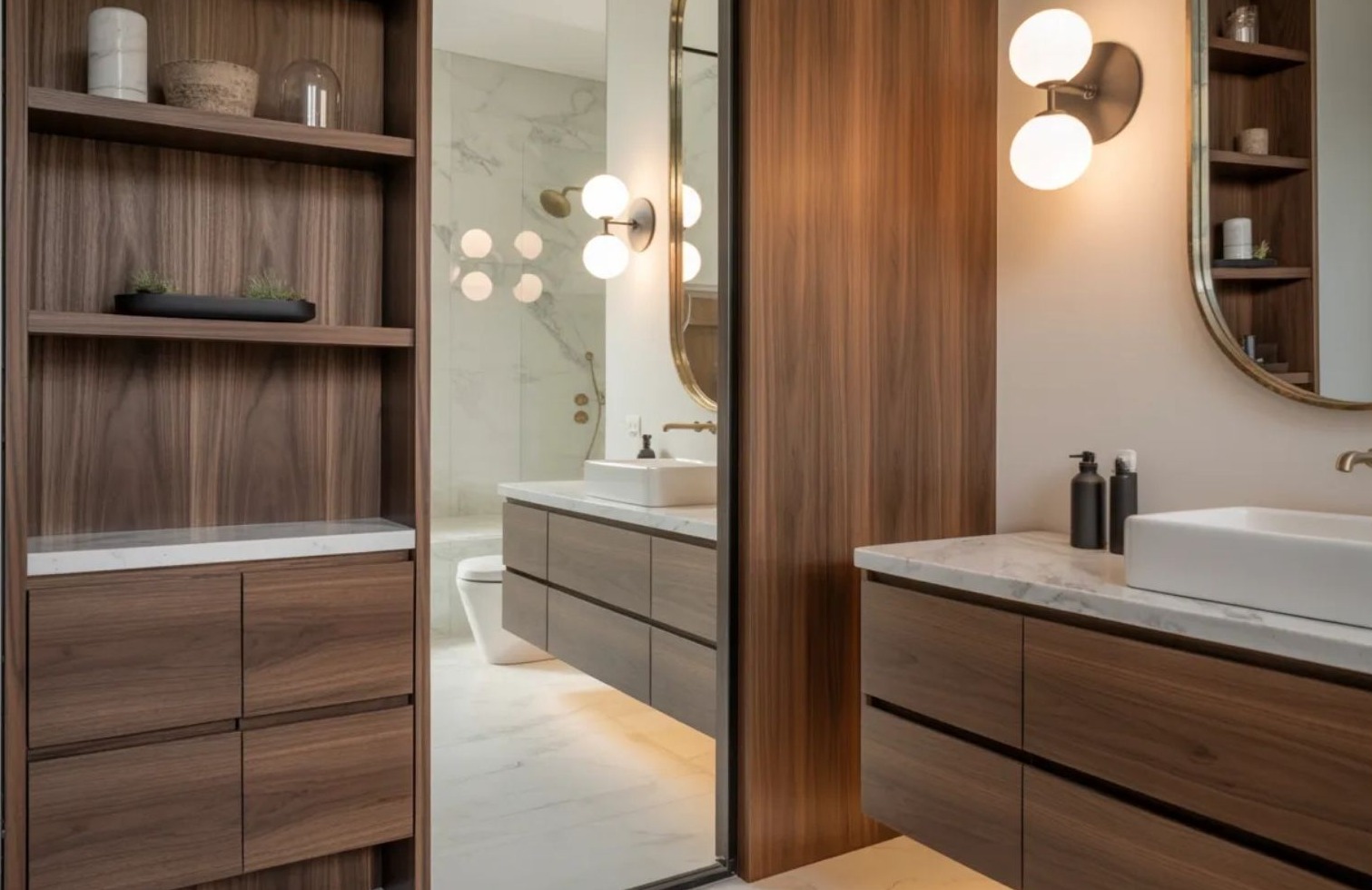 A dió, a fehér tölgy és más meleg faárnyalatok természetességet visznek a fürdőszobába. Mosdóbútorokon, nyitott polcokon vagy burkolati elemként alkalmazva ellensúlyozzák a hideg felületeket, és otthonosabbá teszik a teret.