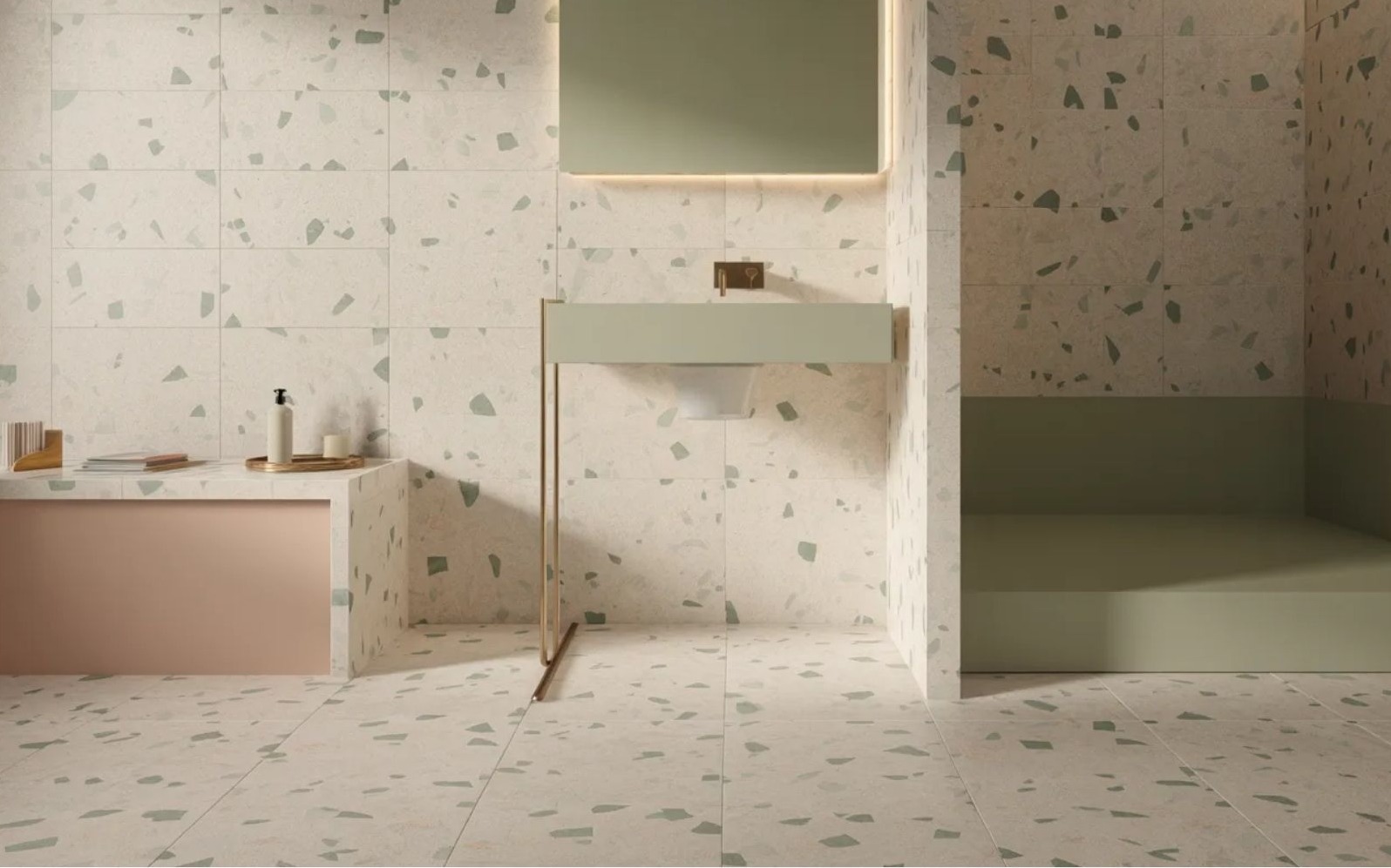 A terrazzo újra mindenhol ott van, és már rég nem csak padlóként. Megjelenik zuhanyfalakon, mosdókban, sőt egybefüggő, beépített felületeken is. A mai terrazzo játékos, mégis fegyelmezett: nagyobb szemcsék, lágyabb színátmenetek és tudatos kontrasztok jellemzik. Nosztalgikus, mégis kortárs, ráadásul tartós és vizuálisan izgalmas anélkül, hogy túlzóvá válna.