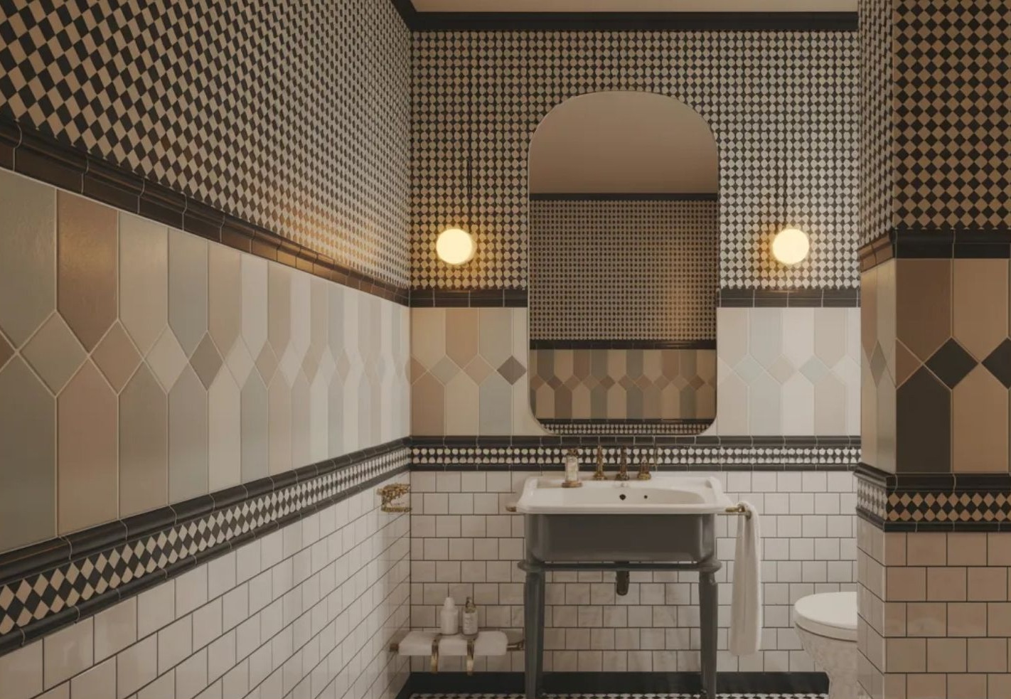 A mintás tapéta ismét fontos szereplője a fürdőszobáknak. Gondosan rétegezve, klasszikus csempékkel és visszafogott bútorokkal kombinálva meghittséget és melegséget ad a térnek. A fekete-fehér kockás minták, a penny round mozaikok és a pasztell geometrikus formák mind visszatérnek, de tompított színekkel és fegyelmezett kompozícióval.