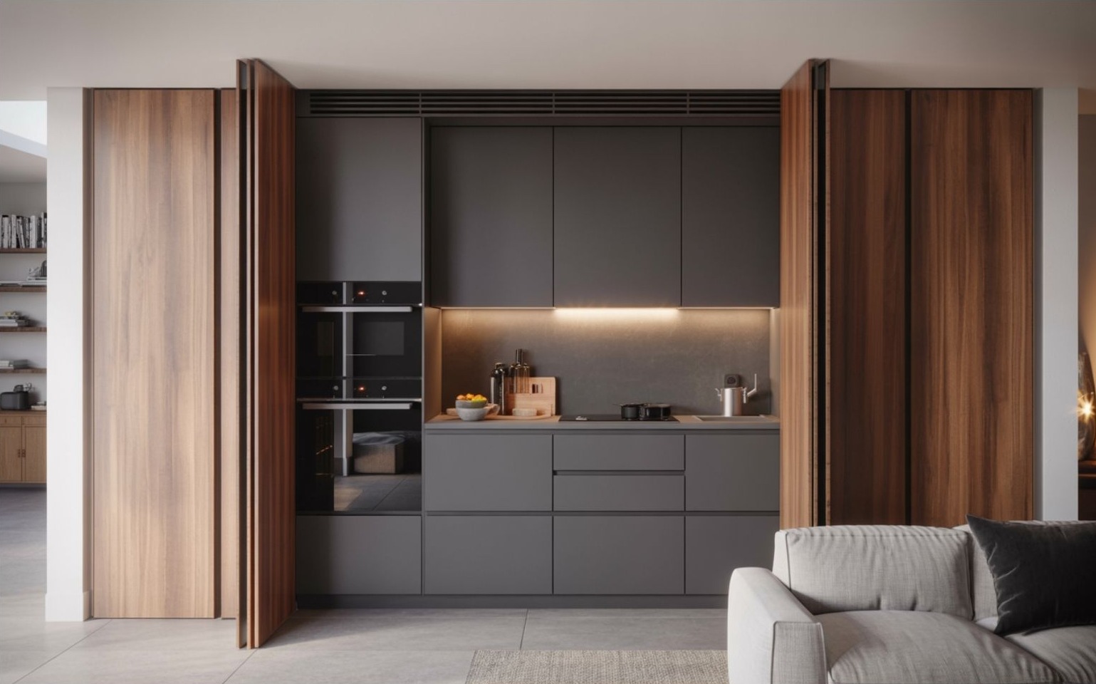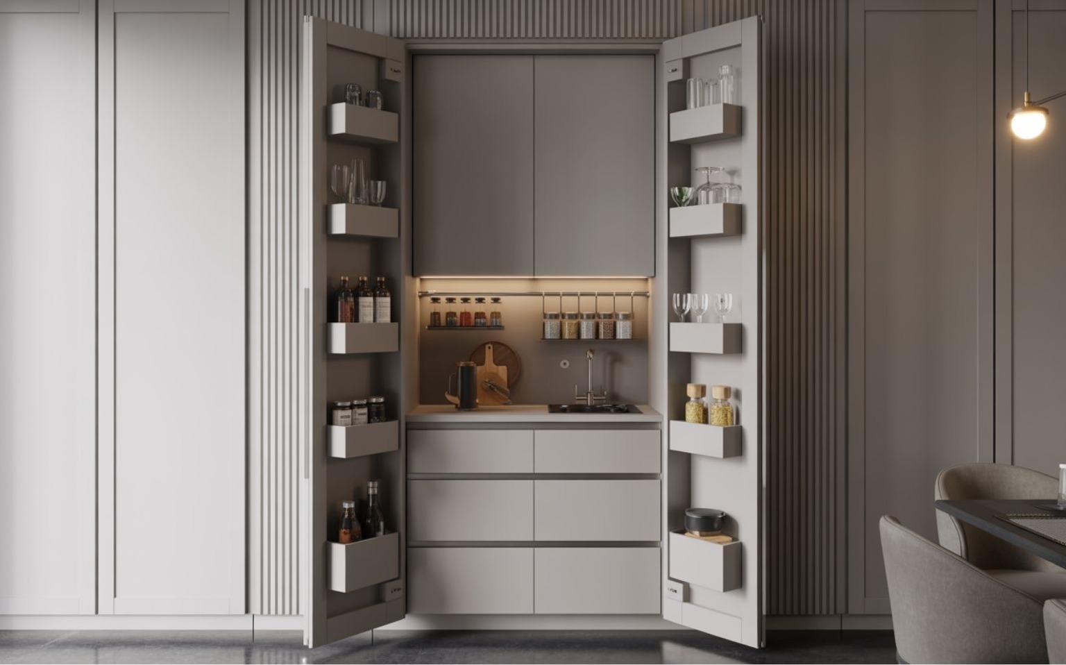 A cupboard kitchen — magyarul: kétszárnyú szekrénykonyha, ajtók mögé rejtett konyha vagy szekrénybe zárt konyha — a láthatatlan funkcionalitás egyik legfejlettebb megoldása. A koncepció egyszerű, mégis radikális: a teljes főző- és előkészítő tér egy nagy, zárható, bútorhatású ajtórendszer mögött kap helyet. Kívülről úgy néz ki, mint egy elegáns, nappaliba illő gardrób vagy könyvszekrény, belül viszont minden megtalálható benne, amit egy modern konyhától elvárunk.