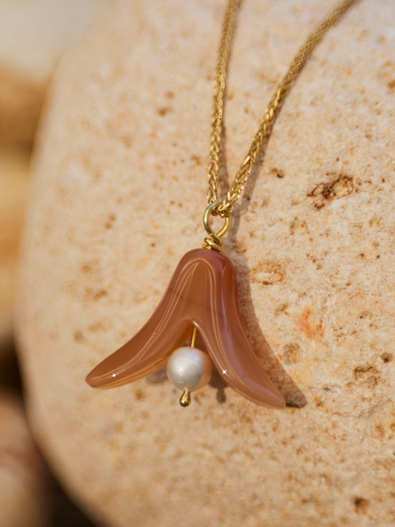 Ez a nyaklánc a természet időtlen szépségét jeleníti meg egy modern, nőies ékszer formájában, amelyet az ELLE DESIGN POP-UP hétvégén te is megtekinthetsz. Az értékes alapanyagokból készült darab eleganciáját az aranyozott ezüst láncról lelógó, kézzel formált motívum és a közepén található apró gyöngy adja, amelyek a harmóniát szimbolizálják. Az őszi, téli szettekhez különösen jól mutatnak a borostyán árnyalatai, így ezt a nyakláncot akár letisztult, akár karakteresebb öltözékekkel is könnyedén összehangolhatod.